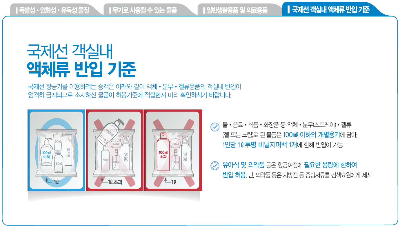 - 국제선 항공기를 이용하려는 승객은 아래와 같이 액체분무겔류용품의 객실내 반입이 엄격히 금지되므로 소지하신 물품이 허용기준에 적합한지 미리 확인하시기 바랍니다.