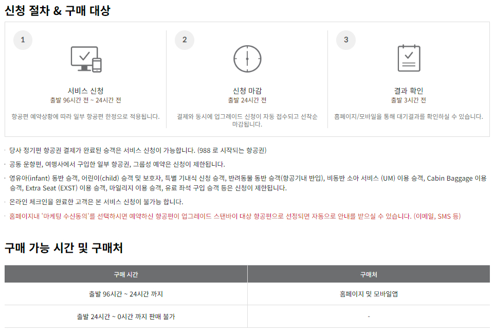 따라서 본 서비스 신청을 위해 상위 클래스 항공권을 구매하더라도, 해당 항공편이 서비스 대상이 되지 않을 수 있으니 주의하시기 바랍니다. - 본 서비스는 항공편 출발 96시간 전 ~ 24시간 전 사이에 홈페이지와 모바일 앱에서 신청할 수 있습니다.