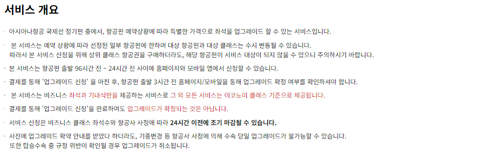 - 아시아나항공 국제선 정기편 중에서, 항공편 예약상황에 따라 특별한 가격으로 좌석을 업그레이드 할 수 있는 서비스입니다.