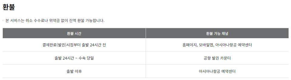 | 결제완료(발권)시점부터 출발 24시간 전 | 홈페이지, 모바일앱, 아시아나항공 예약센터 |