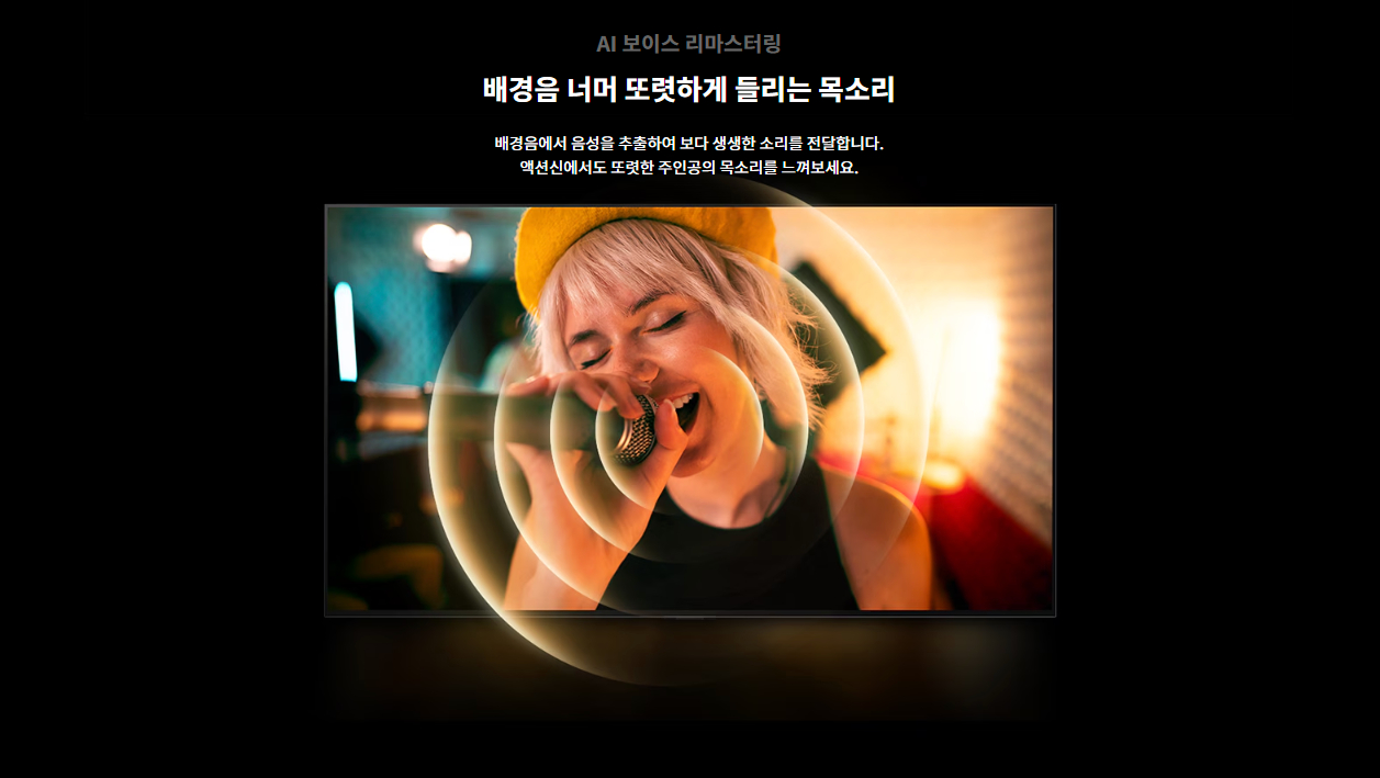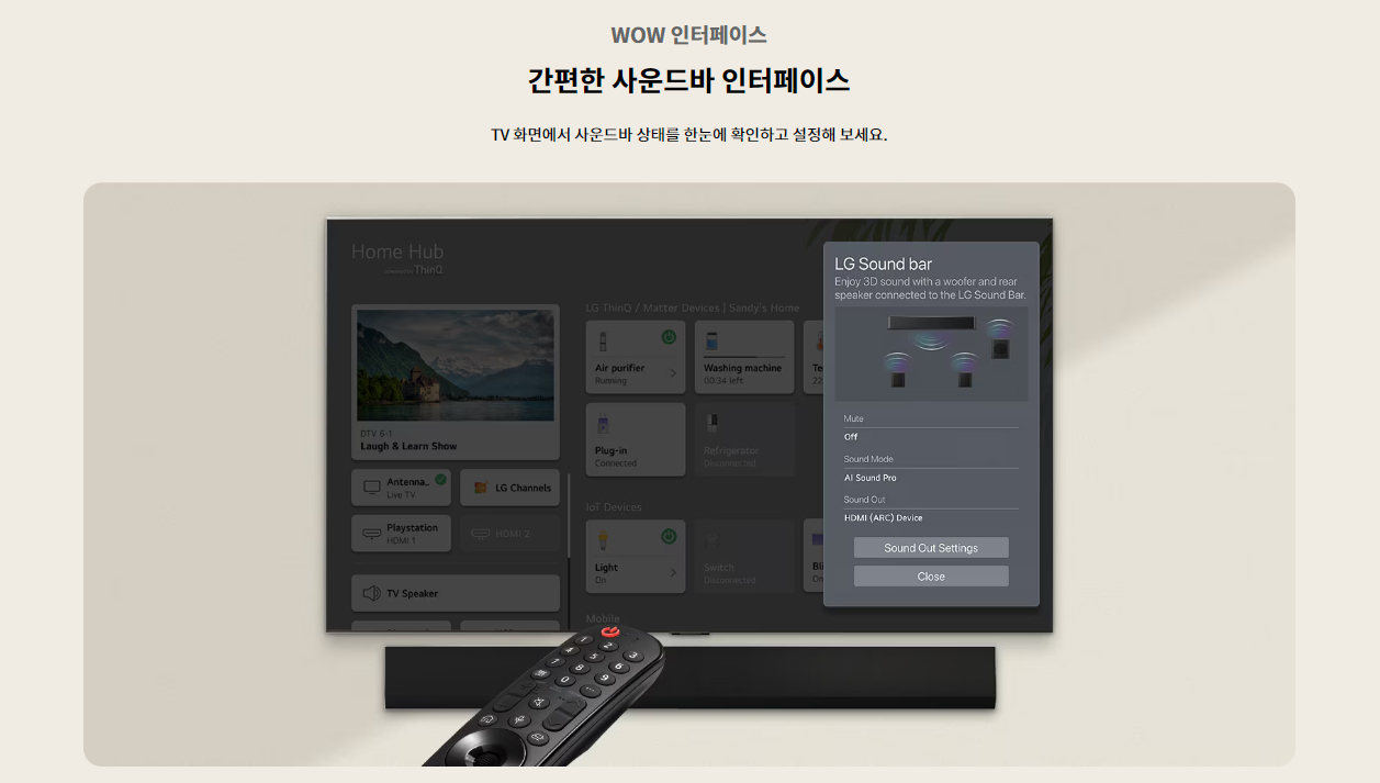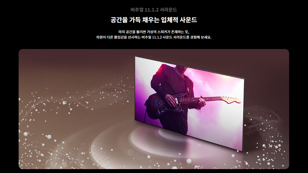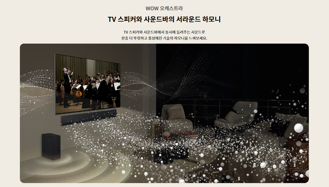 | 사운드 | 스피커 출력 60W 스피커 채널 4.2ch 돌비 애트모스 ○ AI 사운드 AI 사운드 프로 (버츄얼 11.1.2) 클리어보이스 프로 ○ (AI 음성 리마스터링) AI 공간인식 사운드 ○ WiSA 지원 ○ (Up to 2.1 Channel) LG 사운드 싱크 ○ TV 사운드 공유 ○ Simultaneous Audio Output ○ 블루투스 서라운드 레디 ○ (2 Way Playback) 오디오 지원 코덱 AC4, AC3(Dolby Digital), EAC3, HE-AAC, AAC, MP2, MP3, PCM, WMA, apt-X (Refer to manual) |