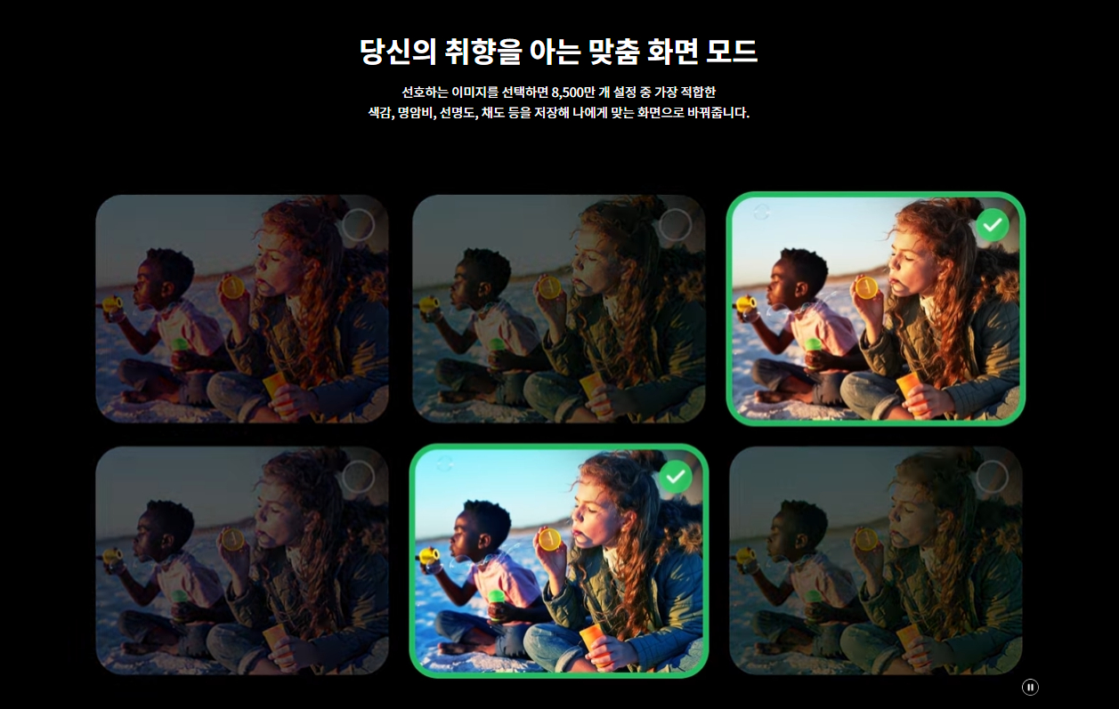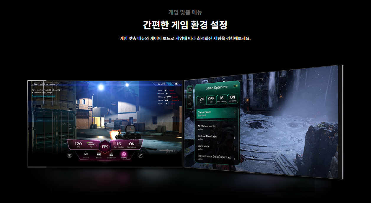 | 게이밍 | G-Sync Compatible ○ 프리싱크(FreeSync) ○ HGIG ○ 게임 맞춤 ○ (게이밍보드) ALLM (Auto Low Latency Mode) ○ VRR (Variable Refresh Rate) ○ (최대 144Hz 지원) |