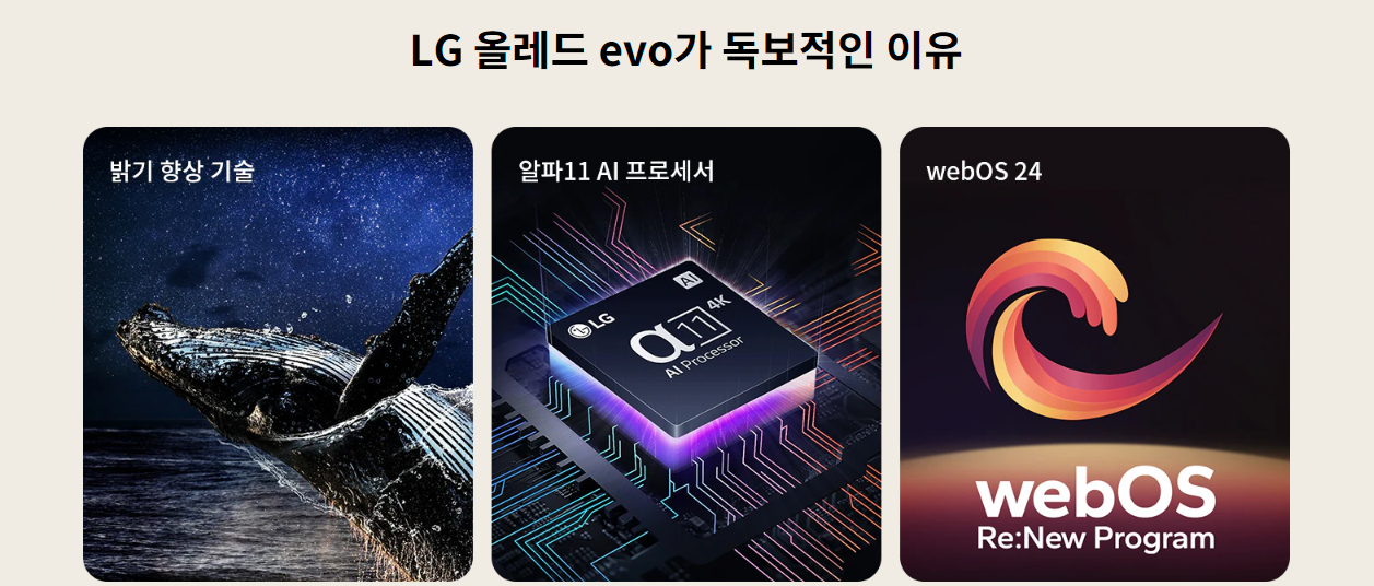 | 화질 | 화질 프로세서 알파11 AI 프로세서 해상도 업스케일링 AI 4K 업스케일링 프로 장르 맞춤 화면 ○ (SDR/HDR) AI 밝기 조정 ○ HDR (High Dynamic Range) Dolby Vision / HDR10 / HLG 필름메이커 모드 ○ HFR (High Frame Rate) 4K 120 fps (HDMI, USB) 다이나믹 톤 매핑 ○ (올레드 다이나믹 톤 매핑 프로) 디밍 방식 올레드 픽셀디밍 모션 프로 올레드 모션 화면모드 10가지 모드 지원 |