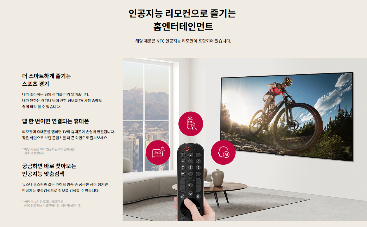 | 스마트 | 운영체제 웹OS(webOS) 24 씽규(ThinQ) ○ 음성인식 ○ 인공지능 리모컨 ○ 애플 에어플레이(Apple Airplay)2 ○ 모바일 리모컨 지원 ○ (LG ThinQ) 다이렉트 음성인식 ○ 웹브라우저 ○ 멀티뷰 ○ 룸투룸 셰어 ○ (메인) 패밀리 세팅 ○ 대기모드 ○ USB 카메라 호환 ○ |