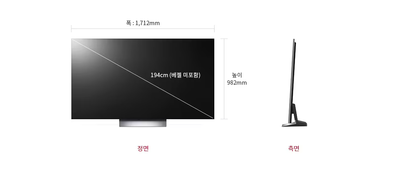 | 디스플레이 | 화면 사이즈 (베젤 미포함) 194 cm 디스플레이 종류 올레드 해상도 4K UHD (3,840 x 2,160) 주사율 120Hz 고색재현 (WCG) 올레드 컬러 |