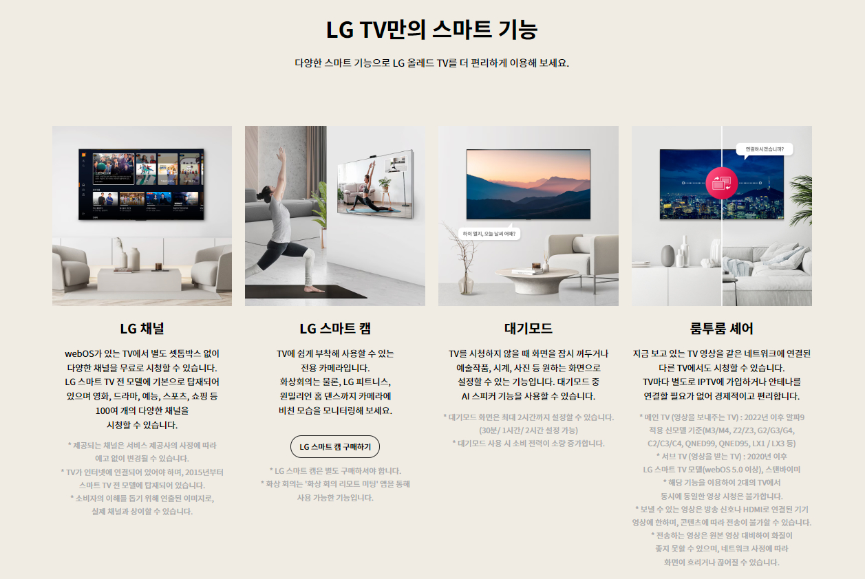 | 스마트 | 운영체제 웹OS(webOS) 24 씽큐(ThinQ) ○ 음성인식 ○ 인공지능 리모컨 ○ 애플 에어플레이(Apple Airplay)2 ○ 모바일 리모컨 지원 ○ (LG ThinQ) 다이렉트 음성인식 ○ 웹브라우저 ○ 멀티뷰 ○ 룸투룸 셰어 ○ (메인) 패밀리 세팅 ○ 대기모드 ○ USB 카메라 호환 ○ |
