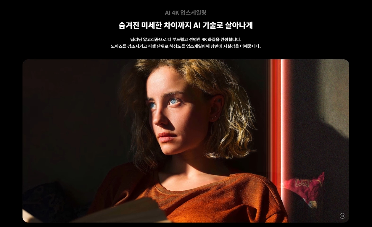 | 화질 | 화질 프로세서 알파11 AI 프로세서 해상도 업스케일링 AI 4K 업스케일링 프로 장르 맞춤 화면 ○ (SDR/HDR) AI 밝기 조정 ○ HDR (High Dynamic Range) Dolby Vision / HDR10 / HLG 필름메이커 모드 ○ HFR (High Frame Rate) 4K 120 fps (HDMI, USB) 다이나믹 톤 매핑 ○ (올레드 다이나믹 톤 매핑 프로) 디밍 방식 올레드 픽셀디밍 모션 프로 올레드 모션 화면모드 10가지 모드 지원 |
