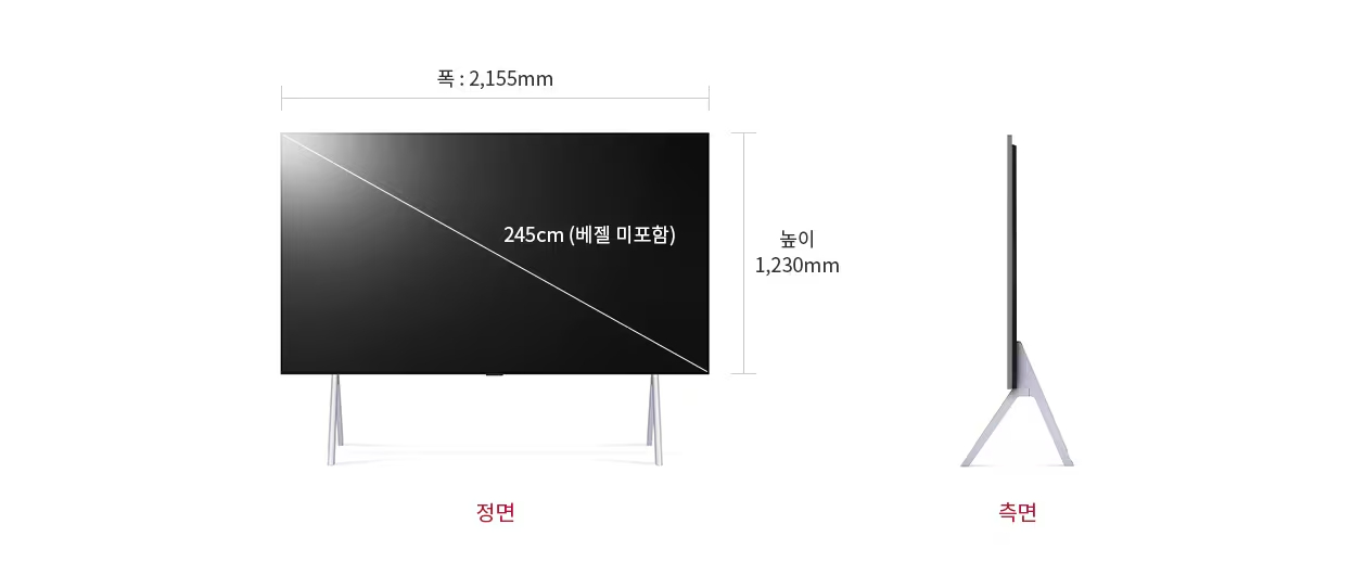 | 크기/무게 | 스탠드 제외크기 (WxHxD, mm) 2,155 x 1,230 x 28.2 스탠드 포함크기 (WxHxD, mm) 2,155 x 1,628 x 580 스탠드 크기 (WxD, mm) 1,628 x 580 스탠드 제외무게 (kg) 57.0kg 스탠드 포함무게 (kg) 64.0kg VESA 규격 (WxH, mm) 600 x 400 |