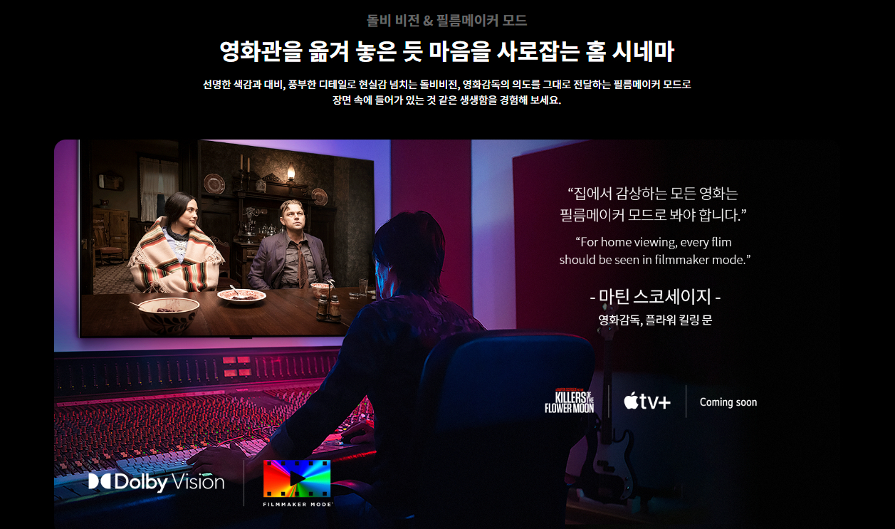 | 사운드 | 스피커 출력 60W 스피커 채널 4.2ch 돌비 애트모스 ○ AI 사운드 AI 사운드 프로 (버츄얼 11.1.2) 클리어보이스 프로 ○ (AI 음성 리마스터링) AI 공간인식 사운드 ○ WiSA 지원 ○ (Up to 2.1 Channel) LG 사운드 싱크 ○ TV 사운드 공유 ○ Simultaneous Audio Output ○ 블루투스 서라운드 레디 ○ (2 Way Playback) 오디오 지원 코덱 AC4, AC3(Dolby Digital), EAC3, HE-AAC, AAC, MP2, MP3, PCM, WMA, apt-X (Refer to manual) |