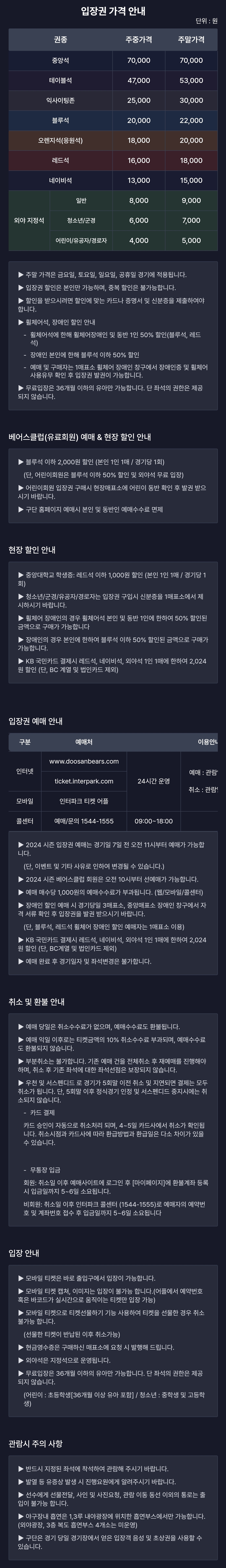 | 인터넷 | https://www.doosanbears.com/ | 24시간 운영 | 예매 : 관람일 경기시작 1시간 후 마감 취소 : 관람일 경기시작 4시간 전 마감 |