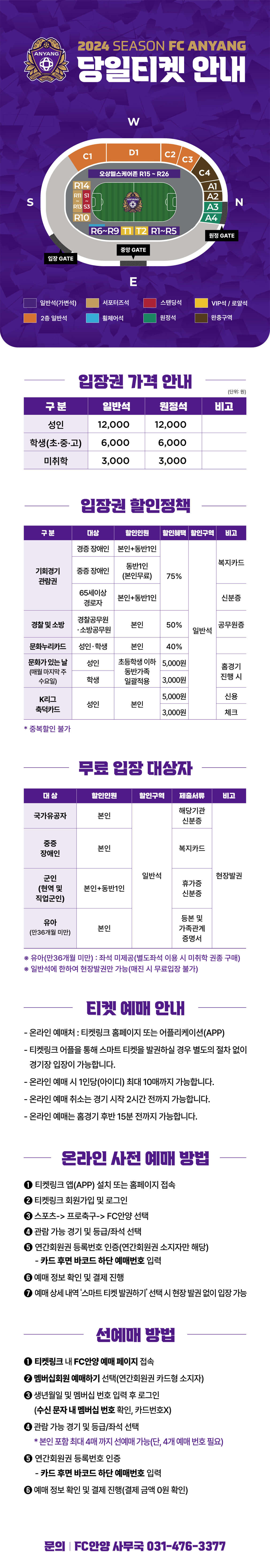 에프씨안양 2024 시즌 프로축구 K케이리그2 안양종합운동장 홈경기 좌석 배치도, 티켓 가격, 할인, 무료입장, 예매 등 관람안내
