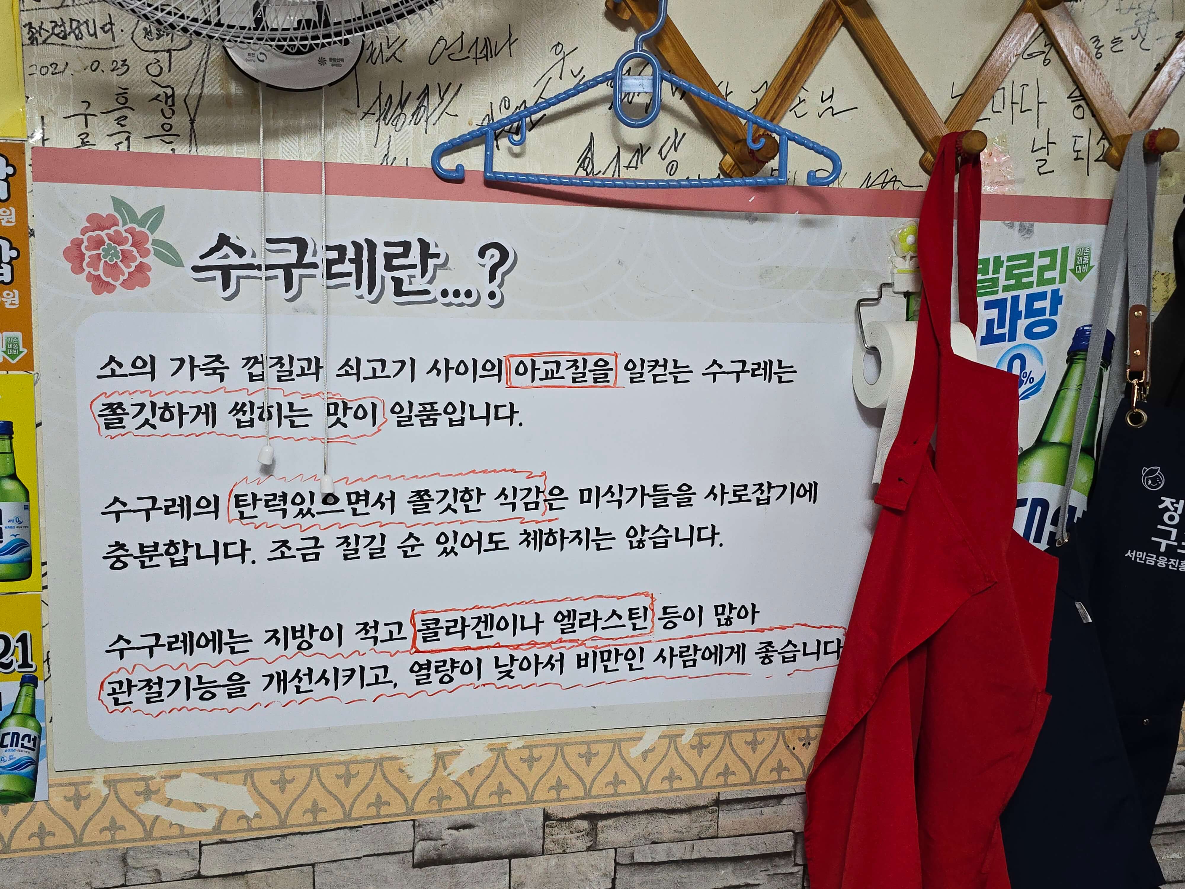 - 소의 가죽 껍질과 쇠고기 사이의 아교질을 일컫는 수구레는 쫄깃하게 씹히는 맛이 일품입니다.
