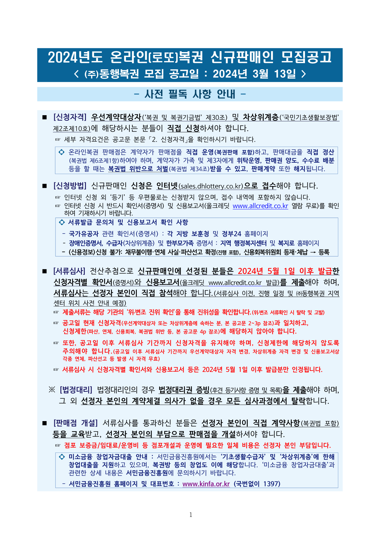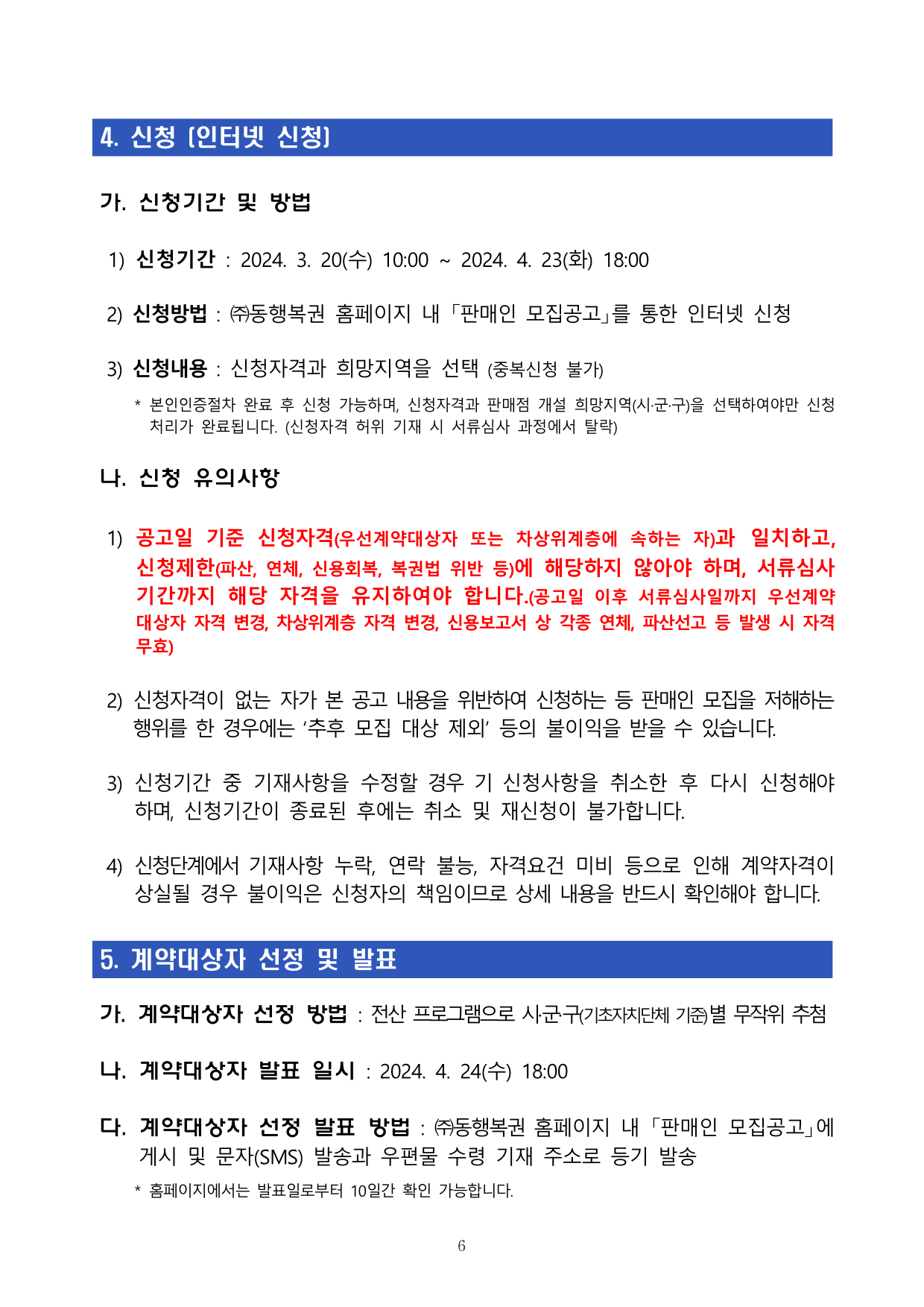 - ㈜동행복권 홈페이지 내 「판매인 모집공고」에 게시 및 문자(SMS) 발송과 우편물 수령 기재 주소로 등기 발송