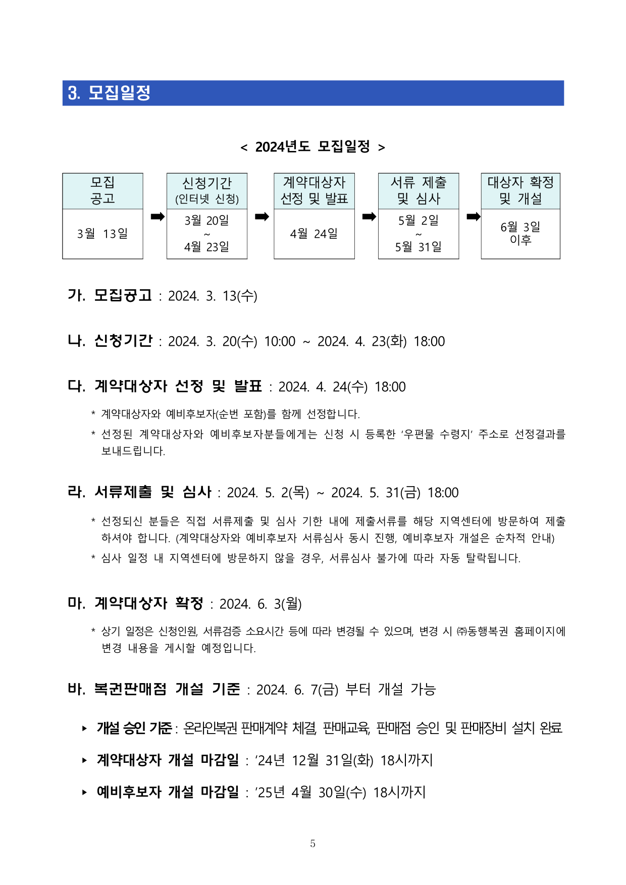 * 상기 일정은 신청인원, 서류검증 소요시간 등에 따라 변경될 수 있으며, 변경 시 ㈜동행복권 홈페이지에 변경 내용을 게시할 예정입니다. - 복권판매점 개설 기준 : 2024.6.7(금)부터 개설 가능