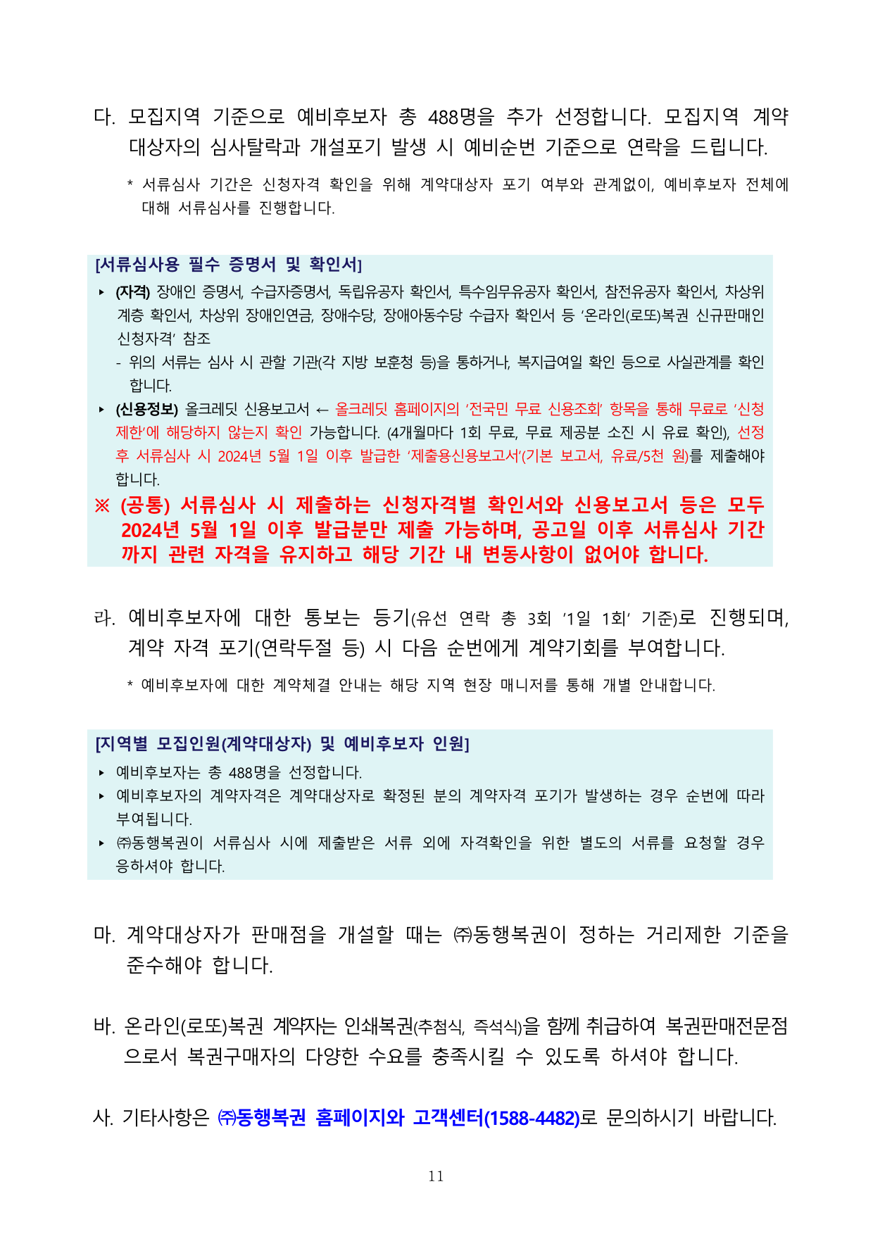 - 계약대상자는 계약과정 중 진행되는 ㈜동행복권의 수시 교육에 필히 참석하셔야하며, ㈜동행복권과 계약대상자의 계약과정에서 필요하다고 판단되는 서류를 제출하셔야 합니다.