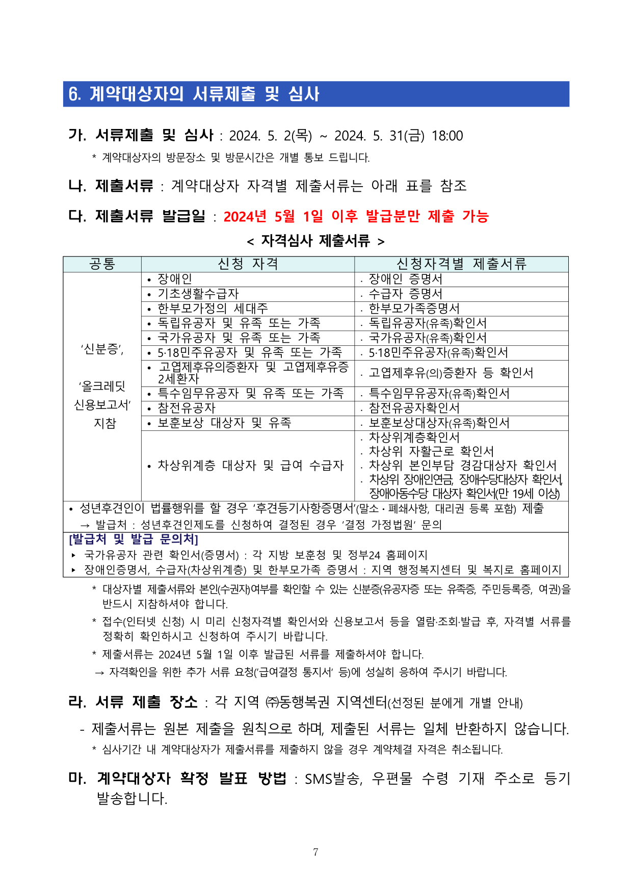 * 서류심사 기간은 신청자격 확인을 위해 계약대상자 포기 여부와 관계없이, 예비후보자 전체에 대해 서류심사를 진행합니다.