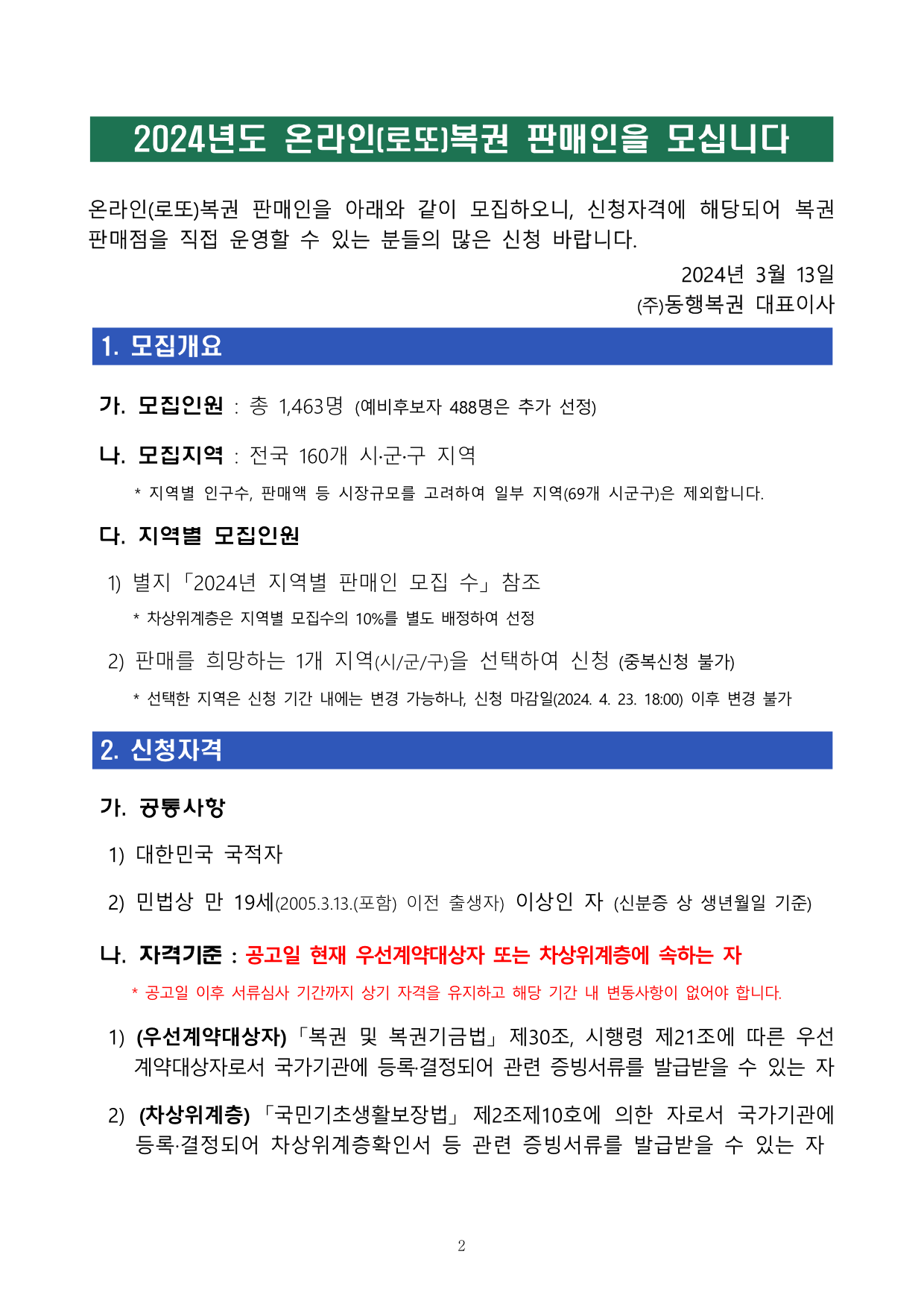 - 신청방법 : ㈜동행복권 홈페이지 내 「판매인 모집공고」를 통한 인터넷 신청 3) 신청내용 : 신청자격과 희망지역을 선택 (중복신청 불가)