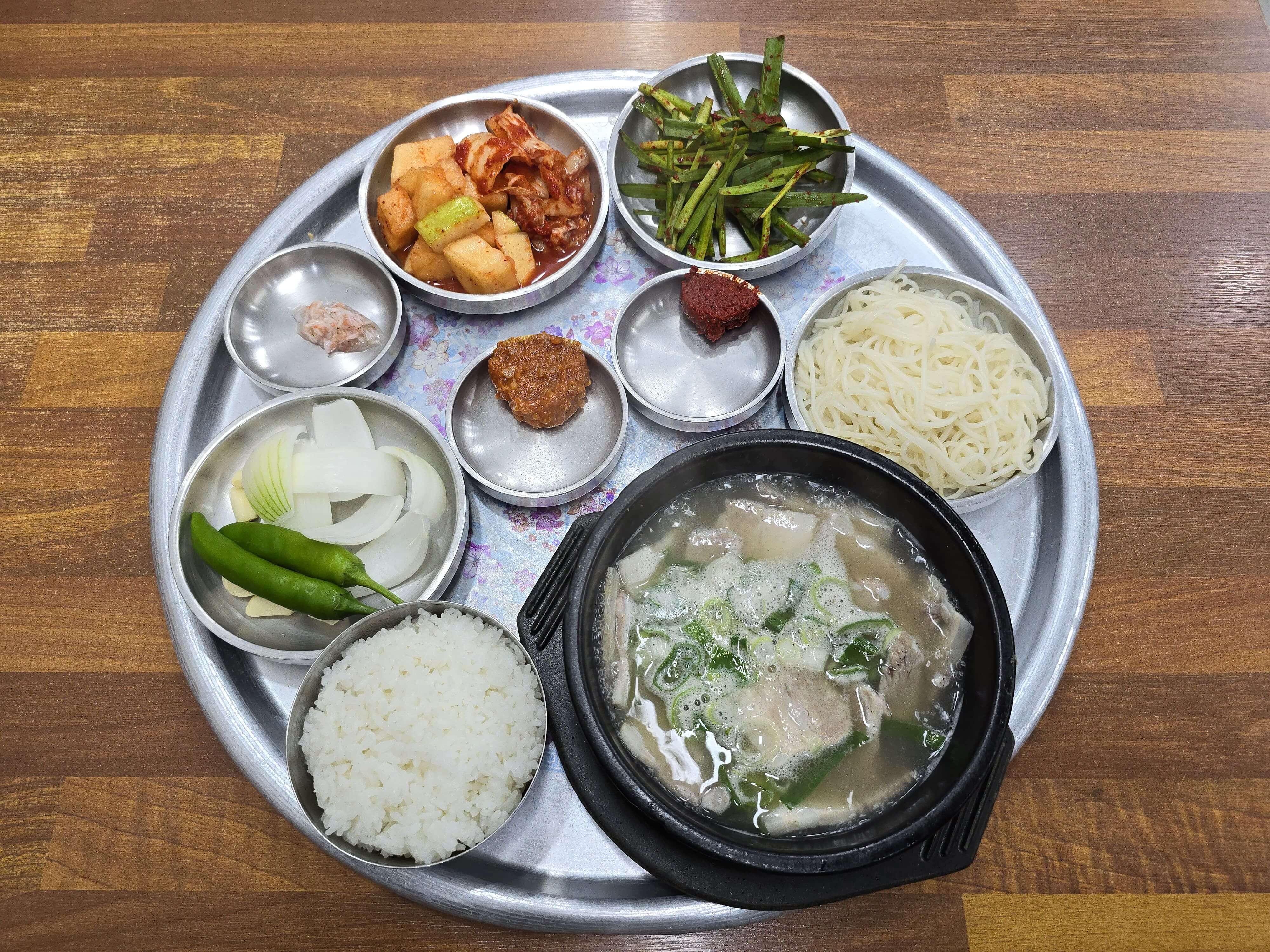 하동식당의 국수 사리는 소면이 아닌 중면이며, 돼지국밥 육수에 한번 삶아서 제공합니다.