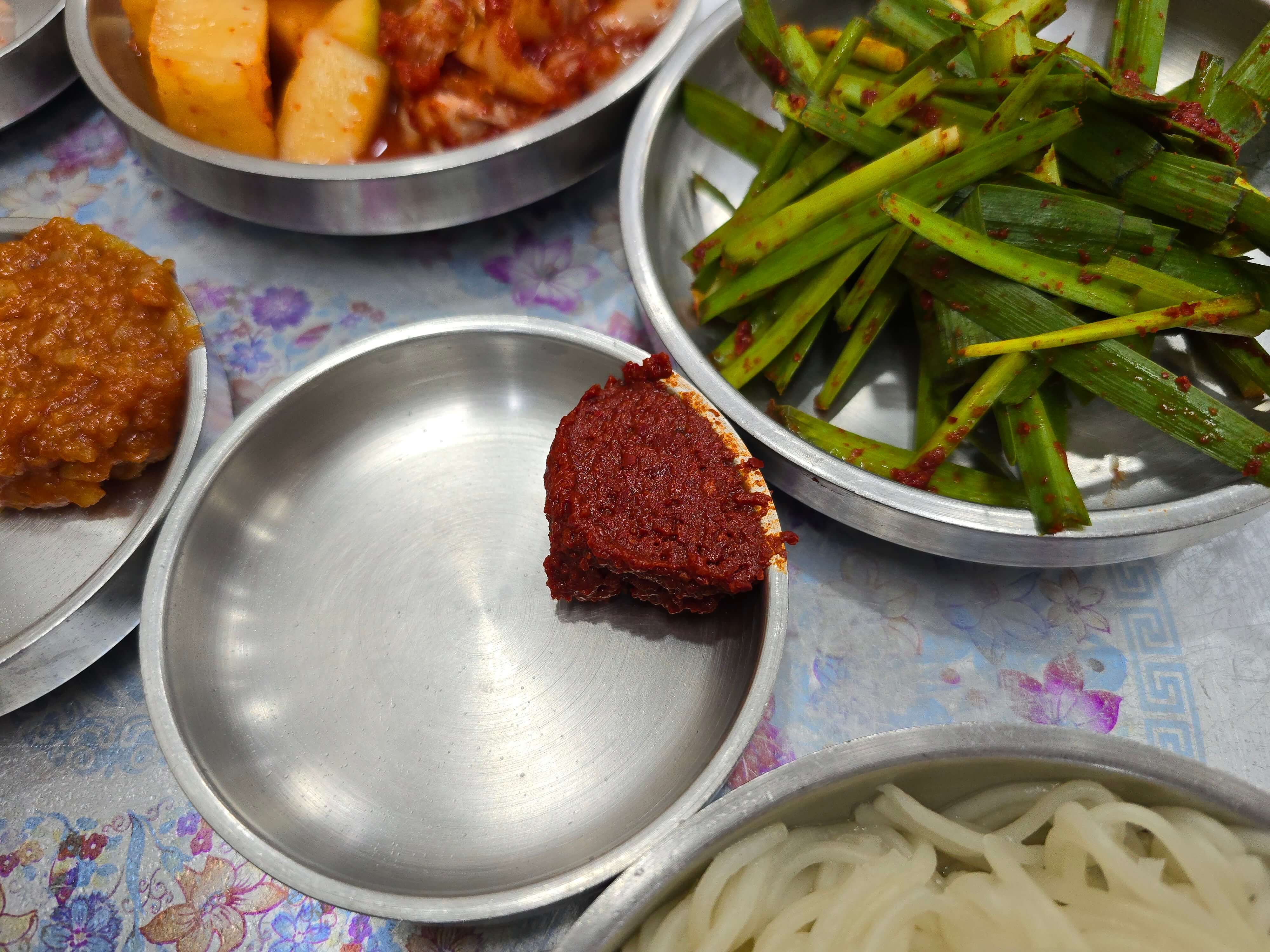 식탁에는 깍두기, 김치, 소금, 후추, 새우젓이 준비되어 있습니다.