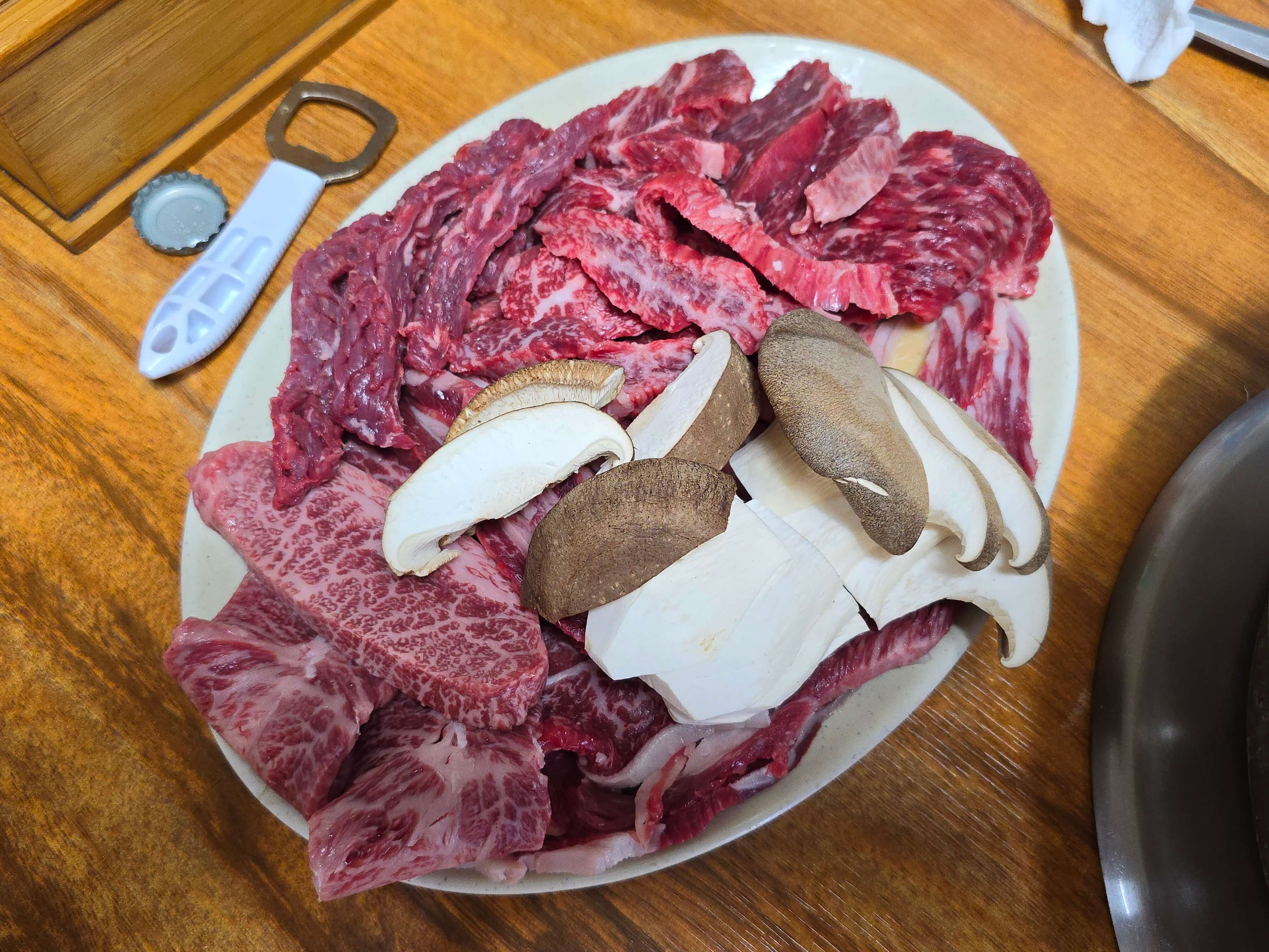 한우 모둠은 여러 부위를 제공하며, 딱 봐도 양이 많아서 2명이서 배불리 먹기에 충분합니다.