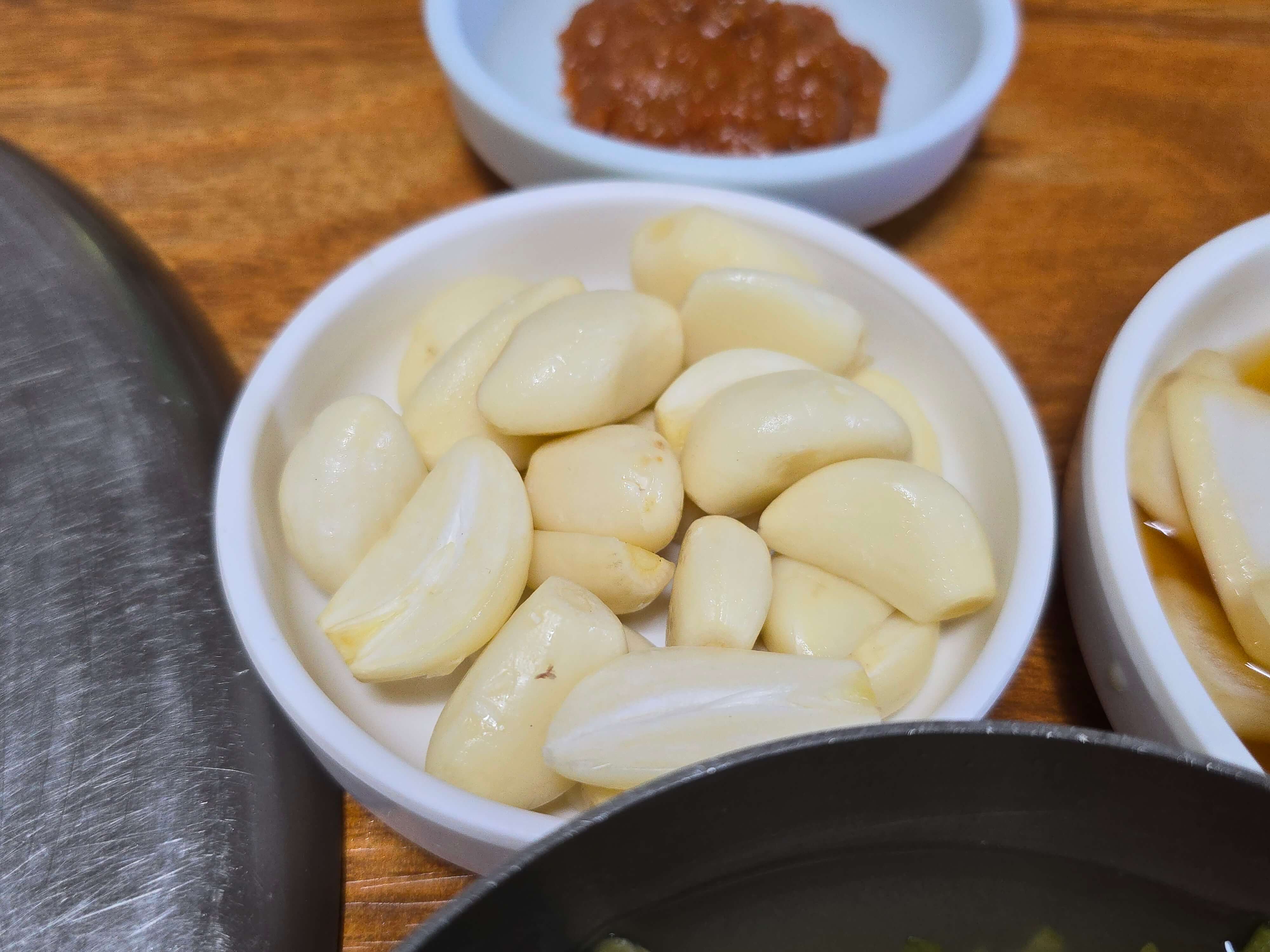고기 한점에 생마늘과 쌈장을 같이 먹으면 아주 꿀맛입니다.