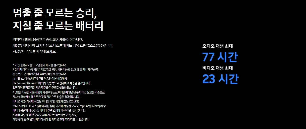 | 디스플레이 | 크기 (Main Display) 193.2 mm 해상도 (Main) 2160 x 1856 (QXGA+) 종류 (Main) Dynamic AMOLED 2X 색심도 (Main) 16 M 크기 (Sub) 158.9 mm 해상도 (Sub) 968 x 2376 (HD+) 종류 (Sub) Dynamic AMOLED 2X 색심도 (Sub) 16 M 최대 주사율 (Main) 120 Hz |
