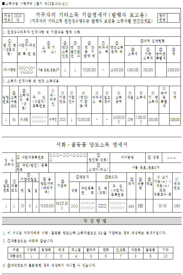 거주자에게 서화·골동품 양도소득을 지급한 원천징수의무자는 「서화·골동품 양도소득 명세서」를 작성, 지급명세서와 함께 제출