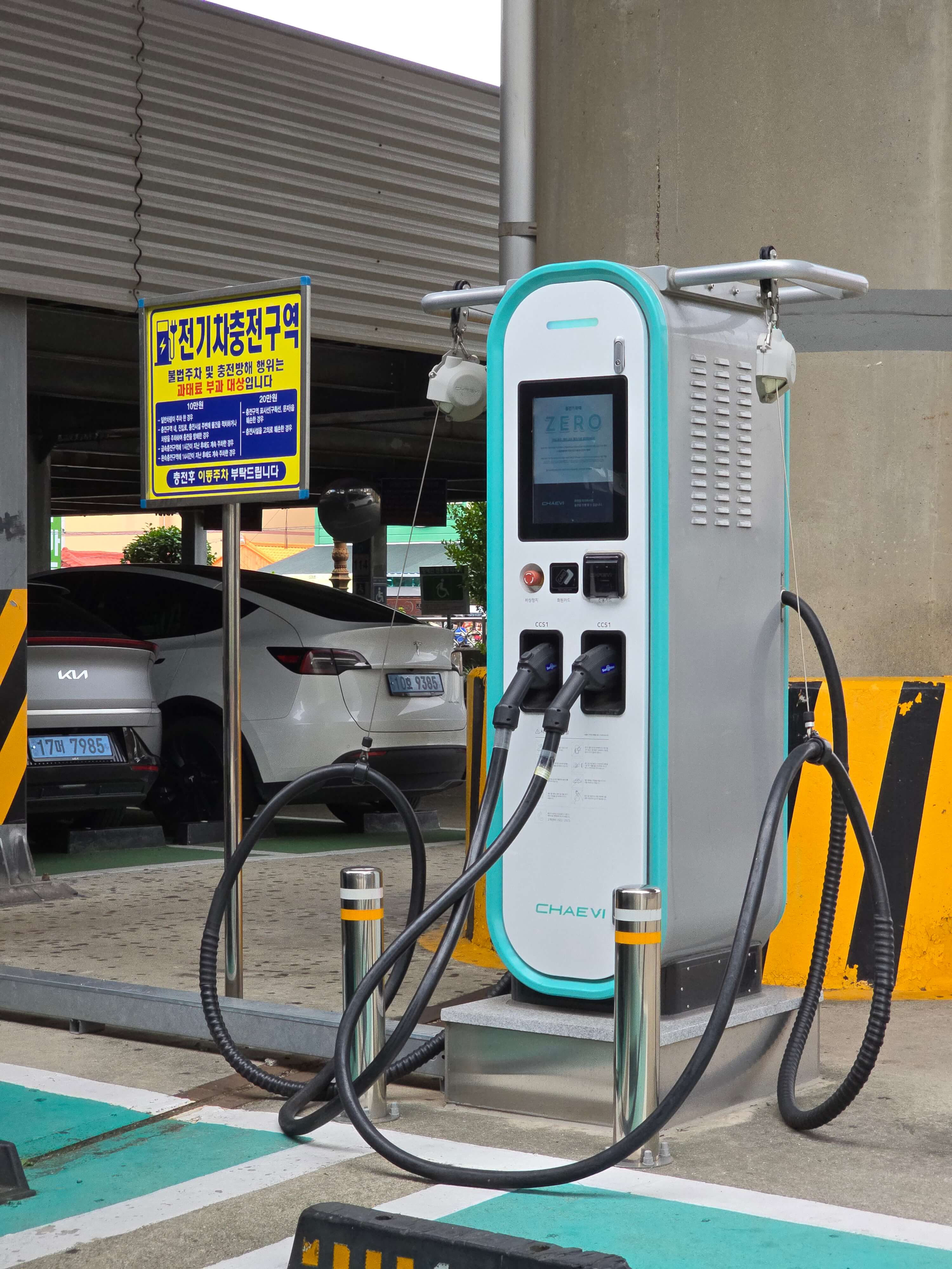 전기차 충전기는 주차장 1층에 설치되어 있습니다.