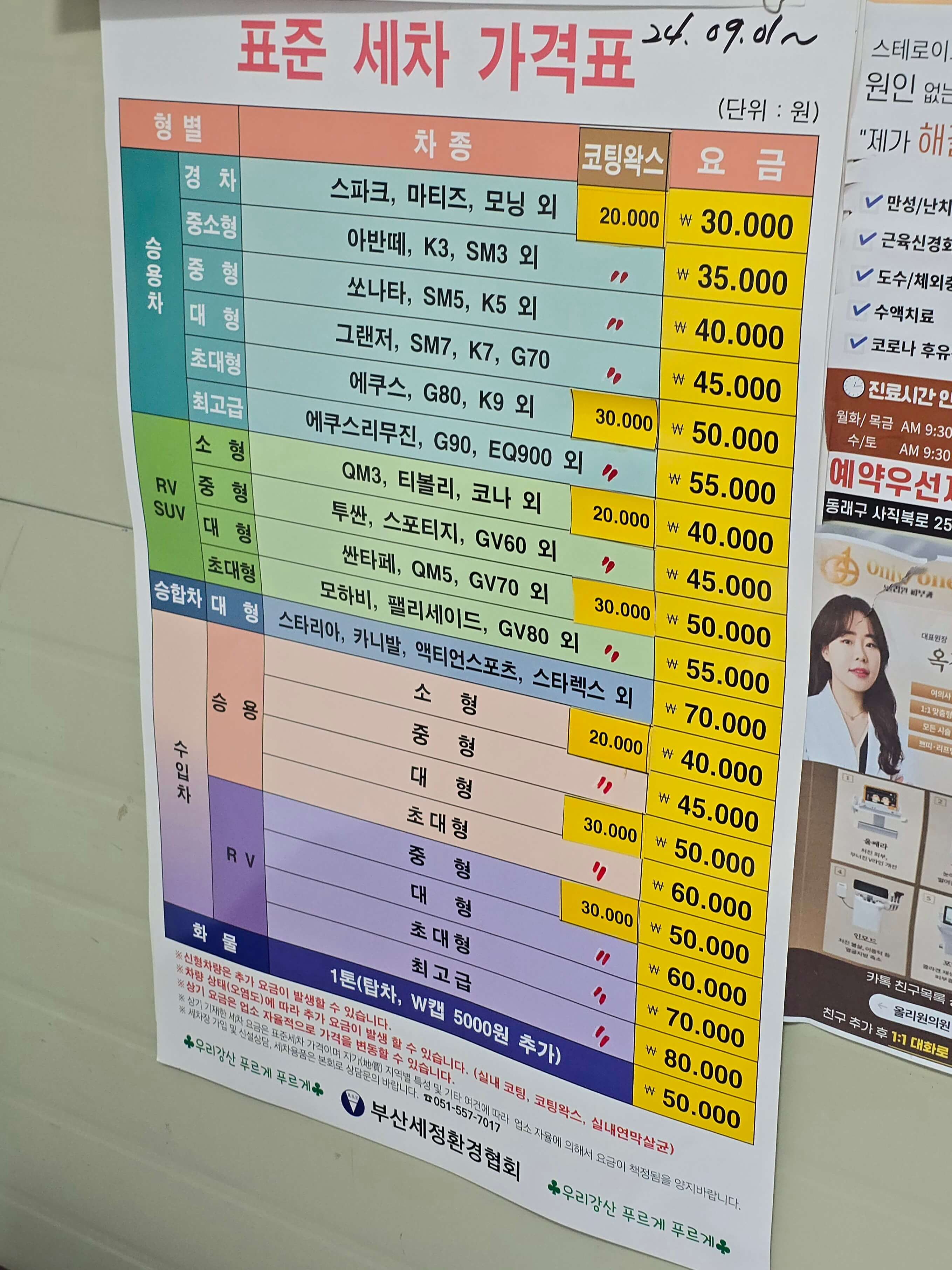 표준 세차 가격표 (2024.9.1 ~ )