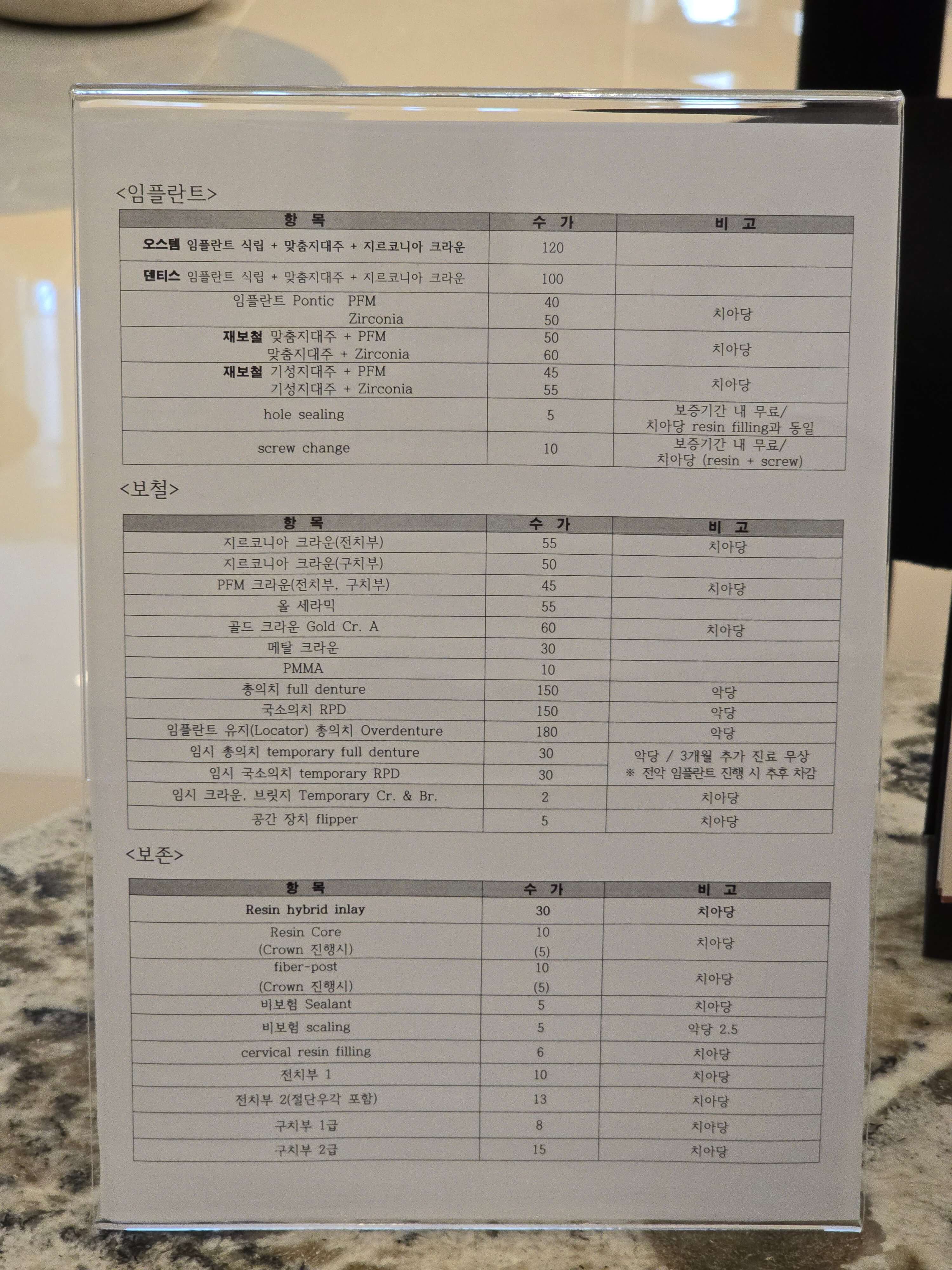 임플란트, 보철, 보존 금액도 항목별로 볼 수 있게 테이블에 비치되어 있습니다.