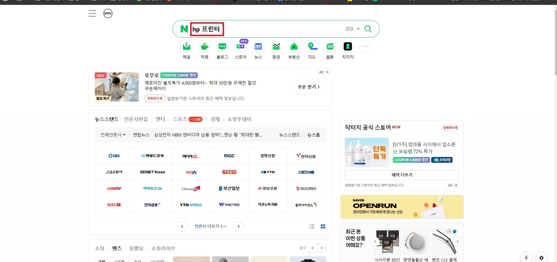 1. 먼저 네이버 검색창에서 'HP 프린터'를 검색합니다.