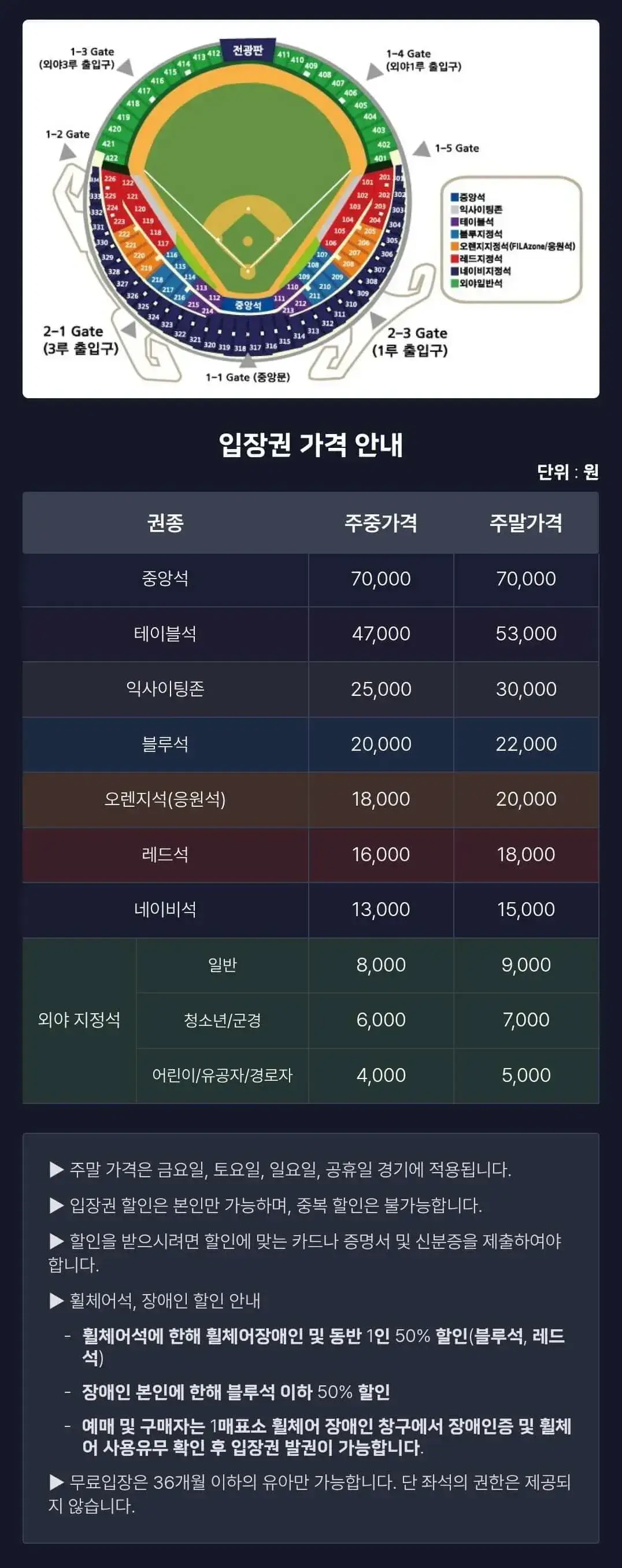 - 주말 가격은 금요일, 토요일, 일요일, 공휴일 경기에 적용됩니다.