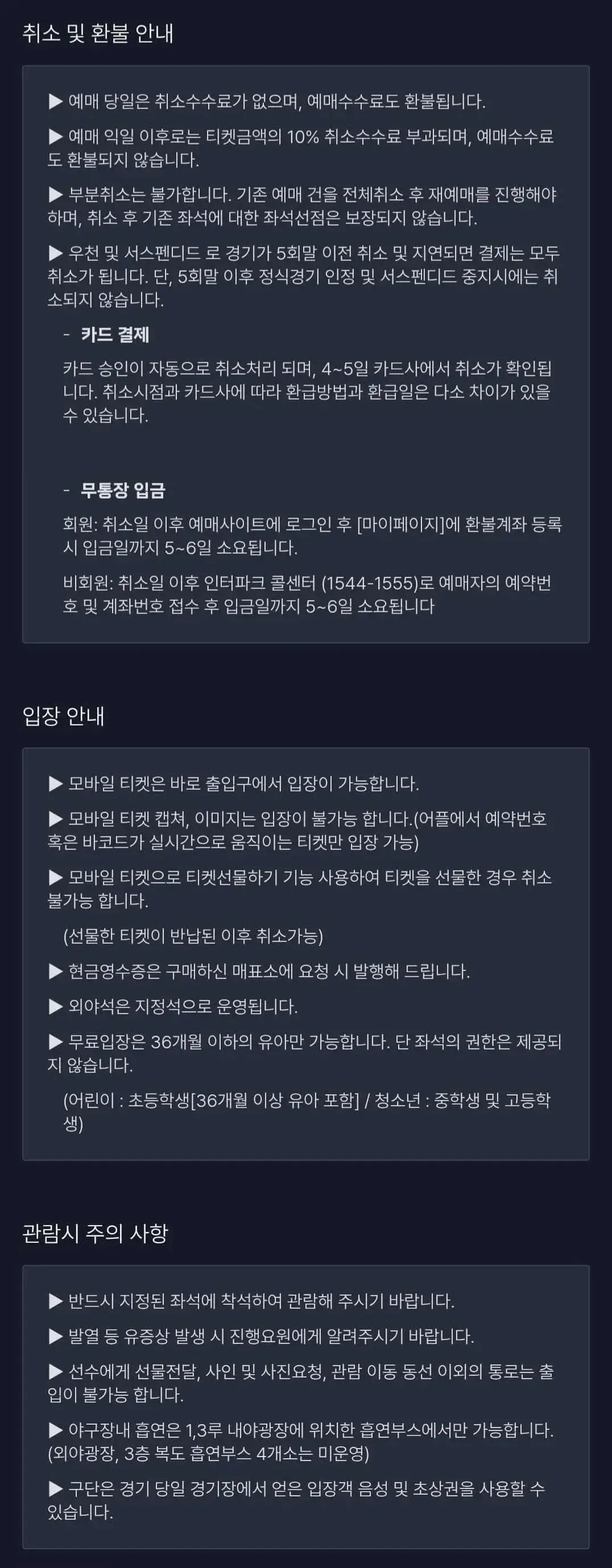 - 예매 완료 후 경기일자 및 좌석변경은 불가합니다.