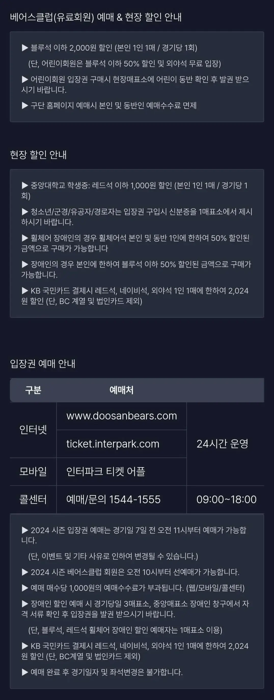 | 인터넷 | https://www.doosanbears.com/ | 24시간 운영 | 예매 : 관람일 경기시작 1시간 후 마감 취소 : 관람일 경기시작 4시간 전 마감 |
