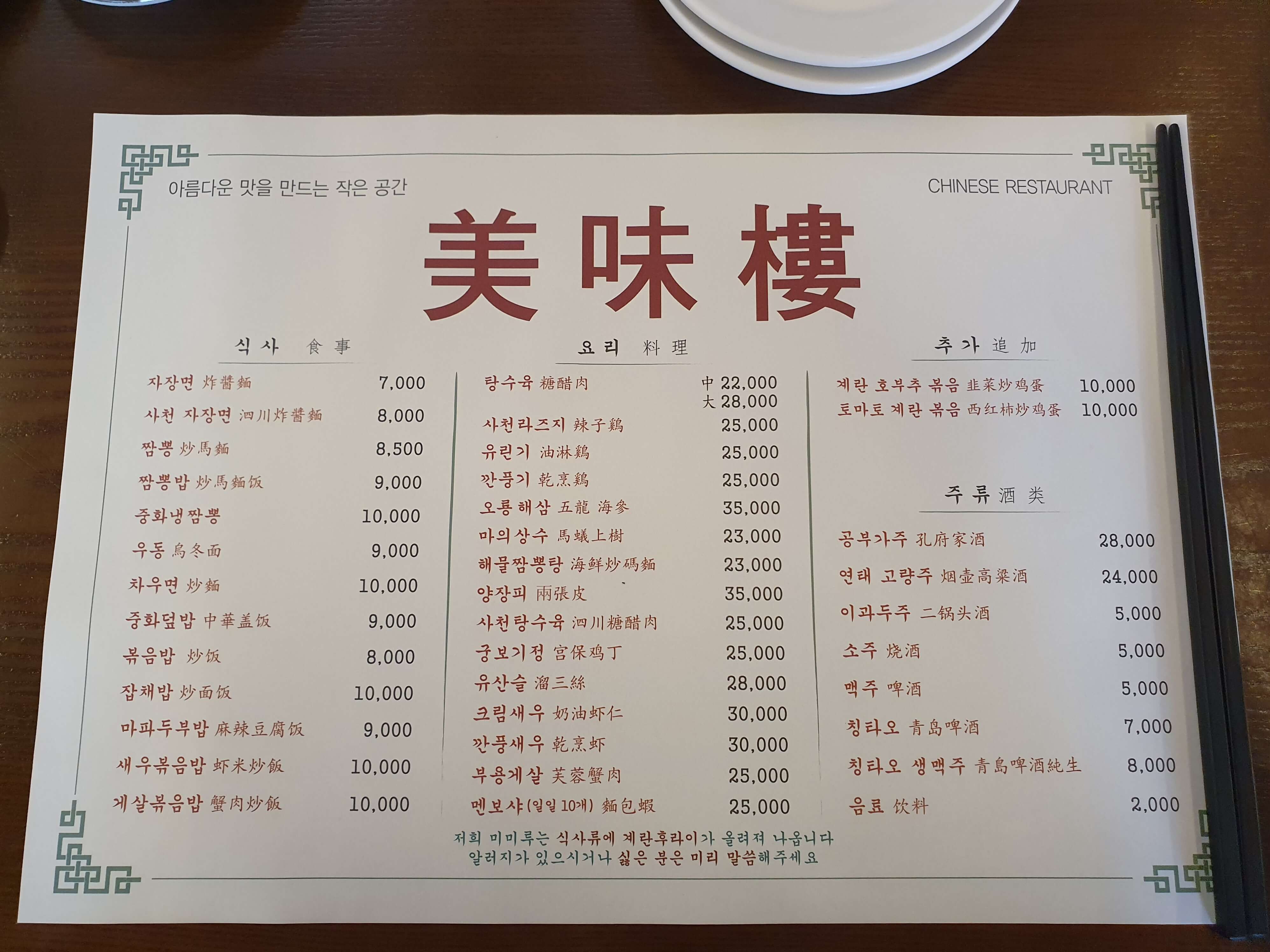 - 주메뉴 : 자장면, 탕수육, 깐풍기, 토마토 계란 볶음