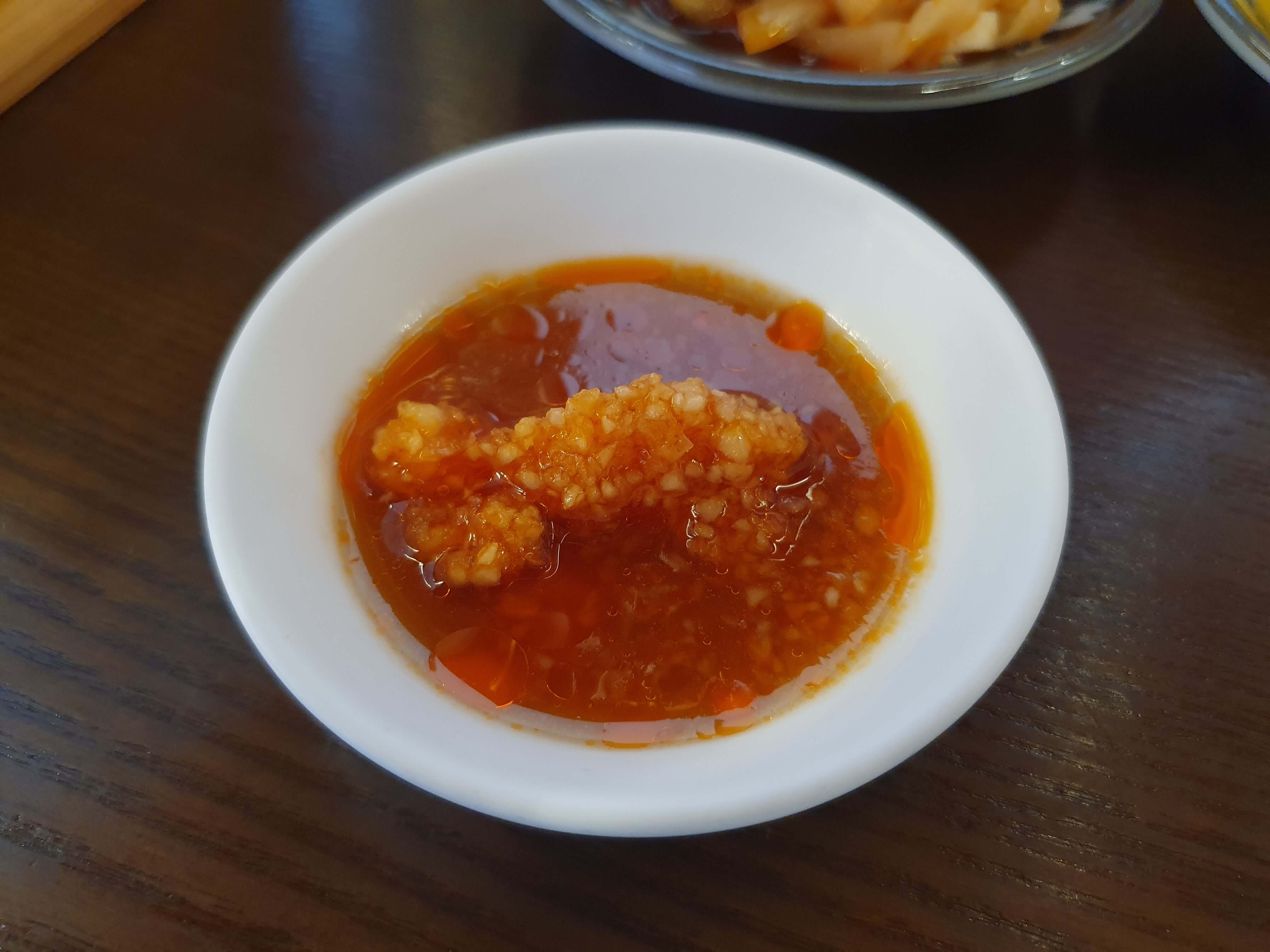 깐풍기와 같이 먹는 소스이며, 간마늘만 나오는데 간장을 부어서 드시면 됩니다.