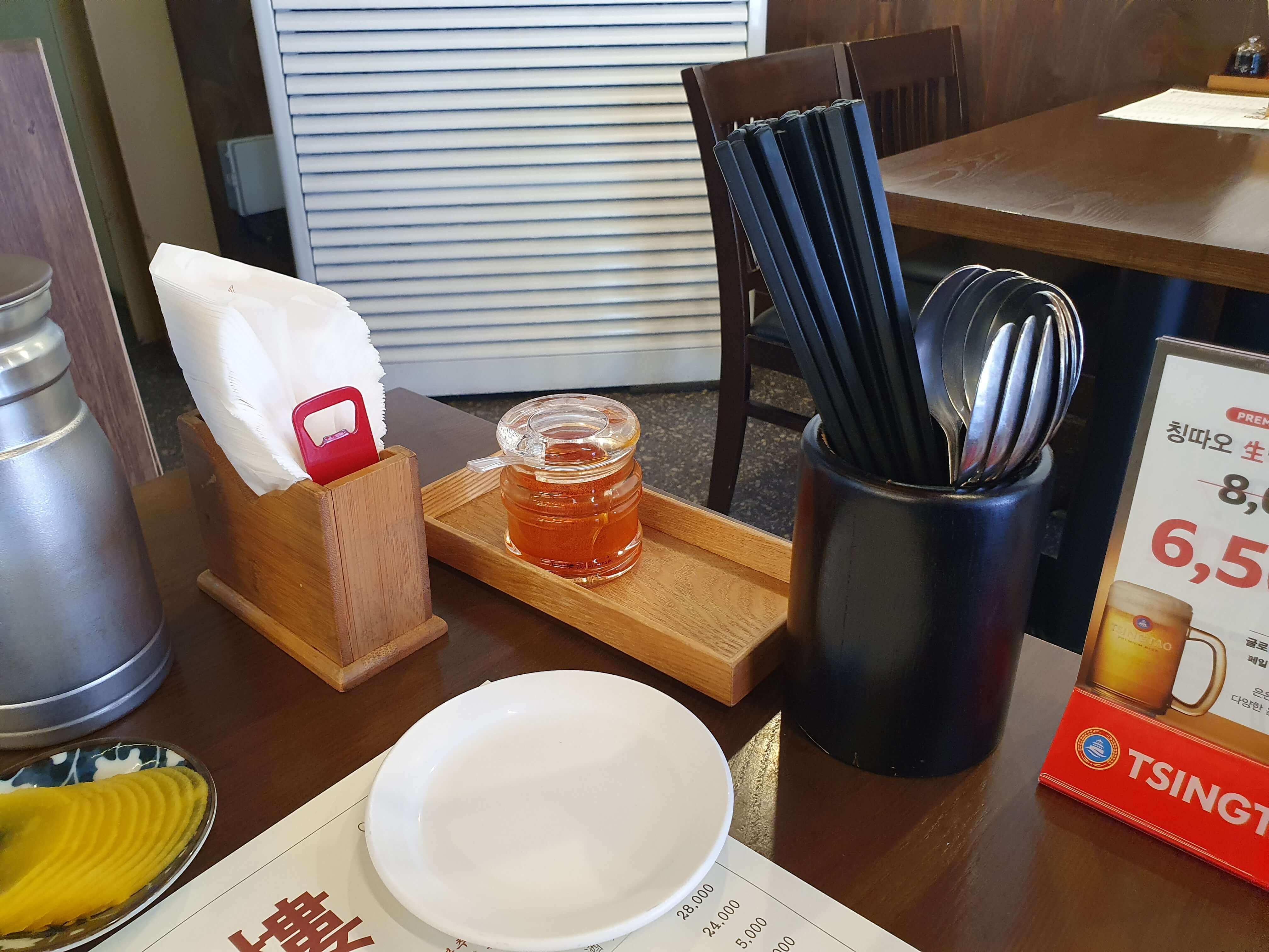 테이블에는 고추가루, 숟가락, 젓가락, 휴지가 준비되어 있습니다.