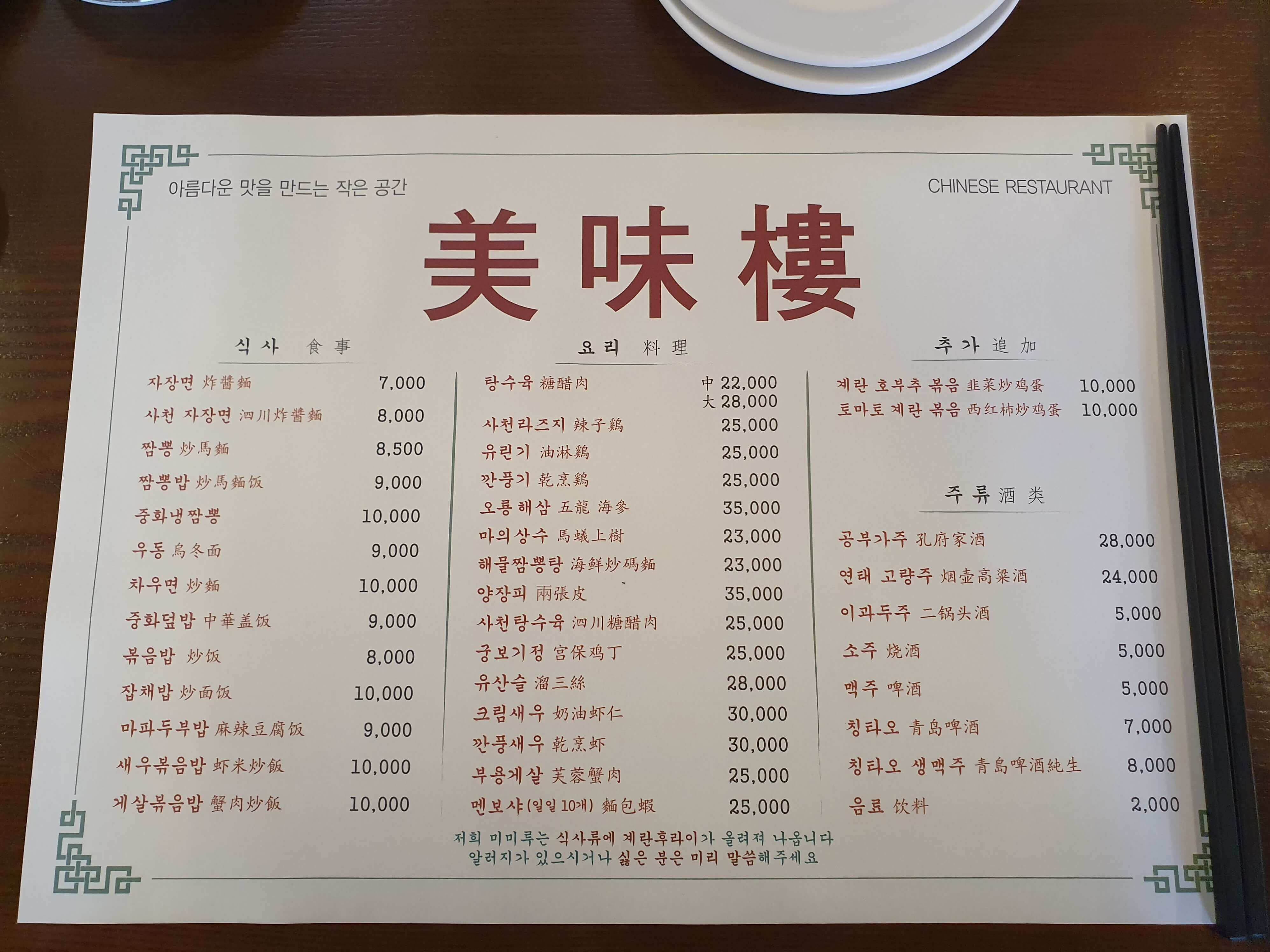 - 주메뉴 : 짜장면, 짬뽕, 차우면, 탕수육, 깐풍기, 계란 호부추 볶음