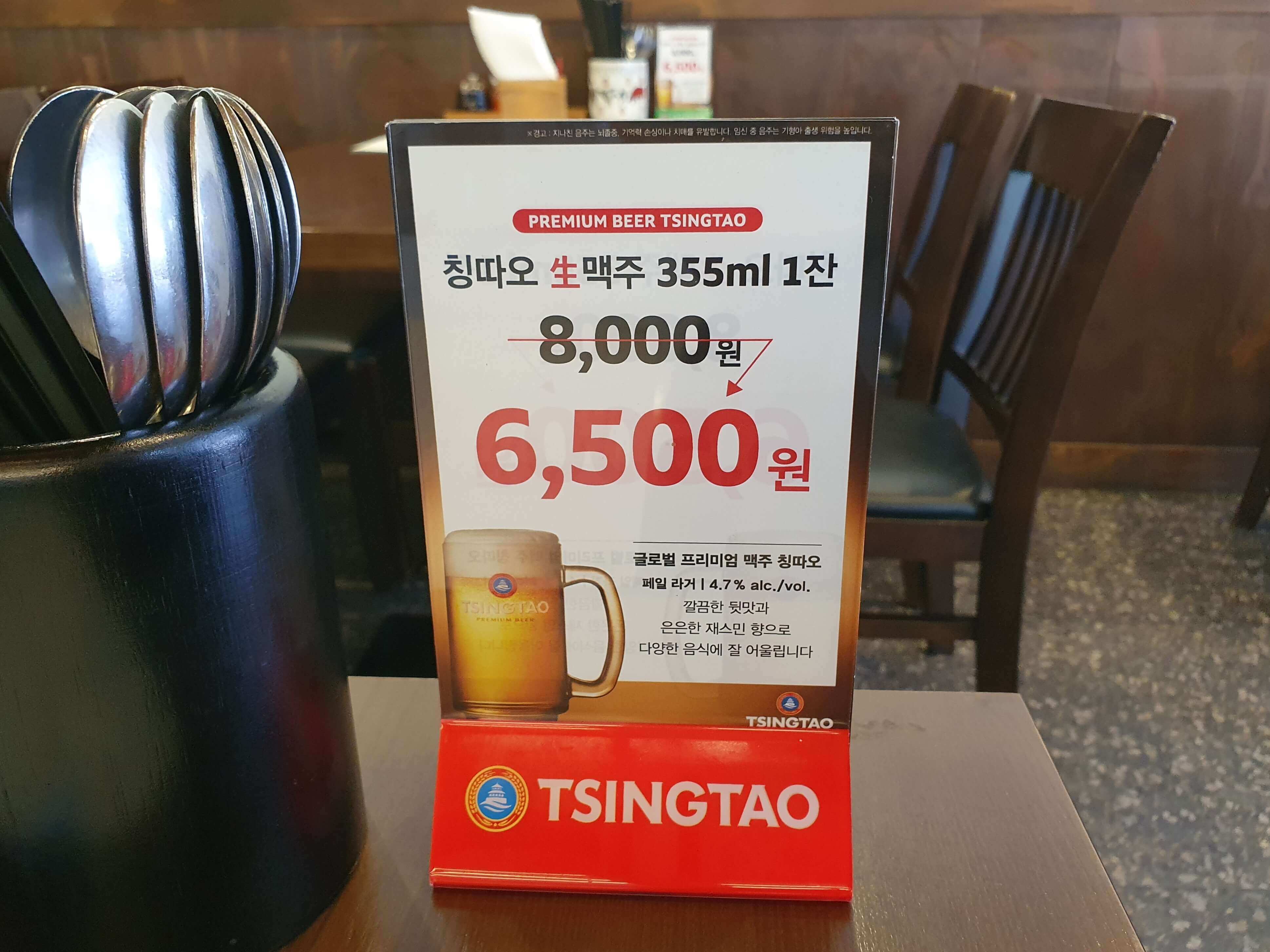 칭따오 생맥주도 판매하고 있으며, 355ml 1잔 가격은 6,500원입니다.