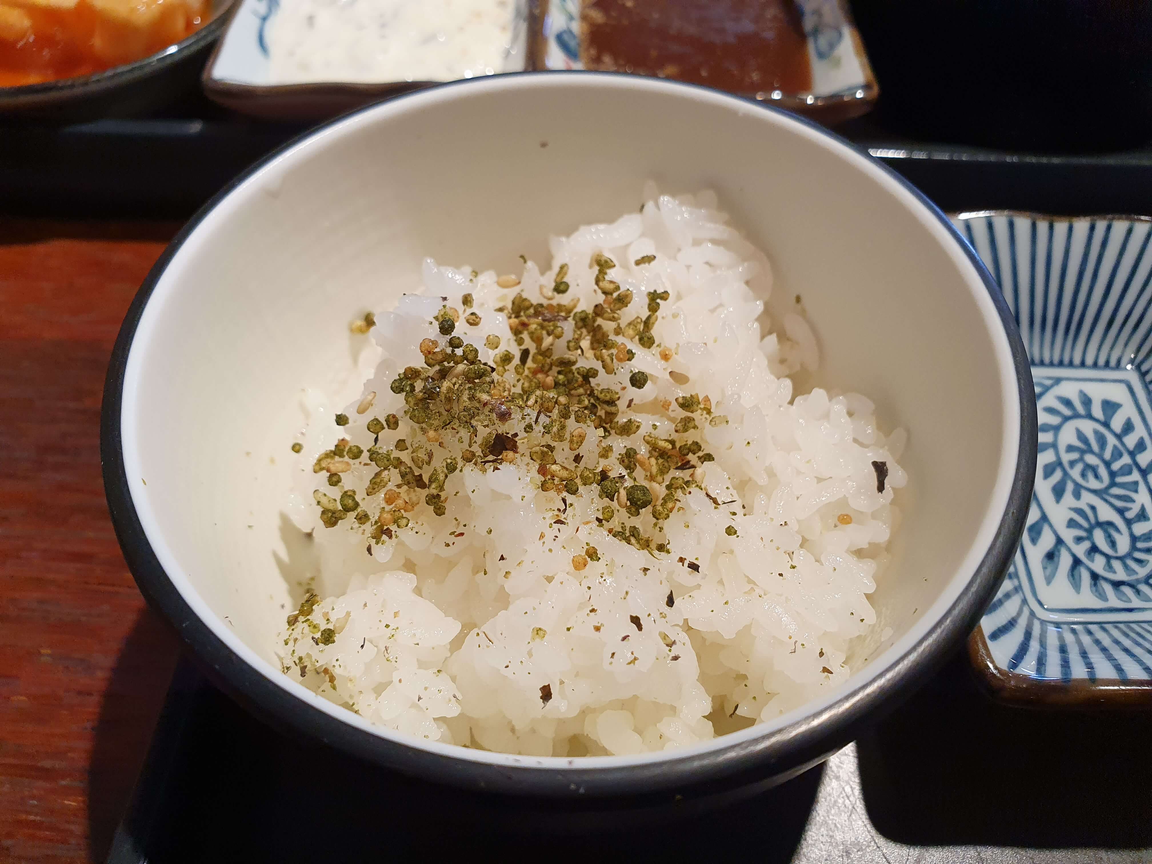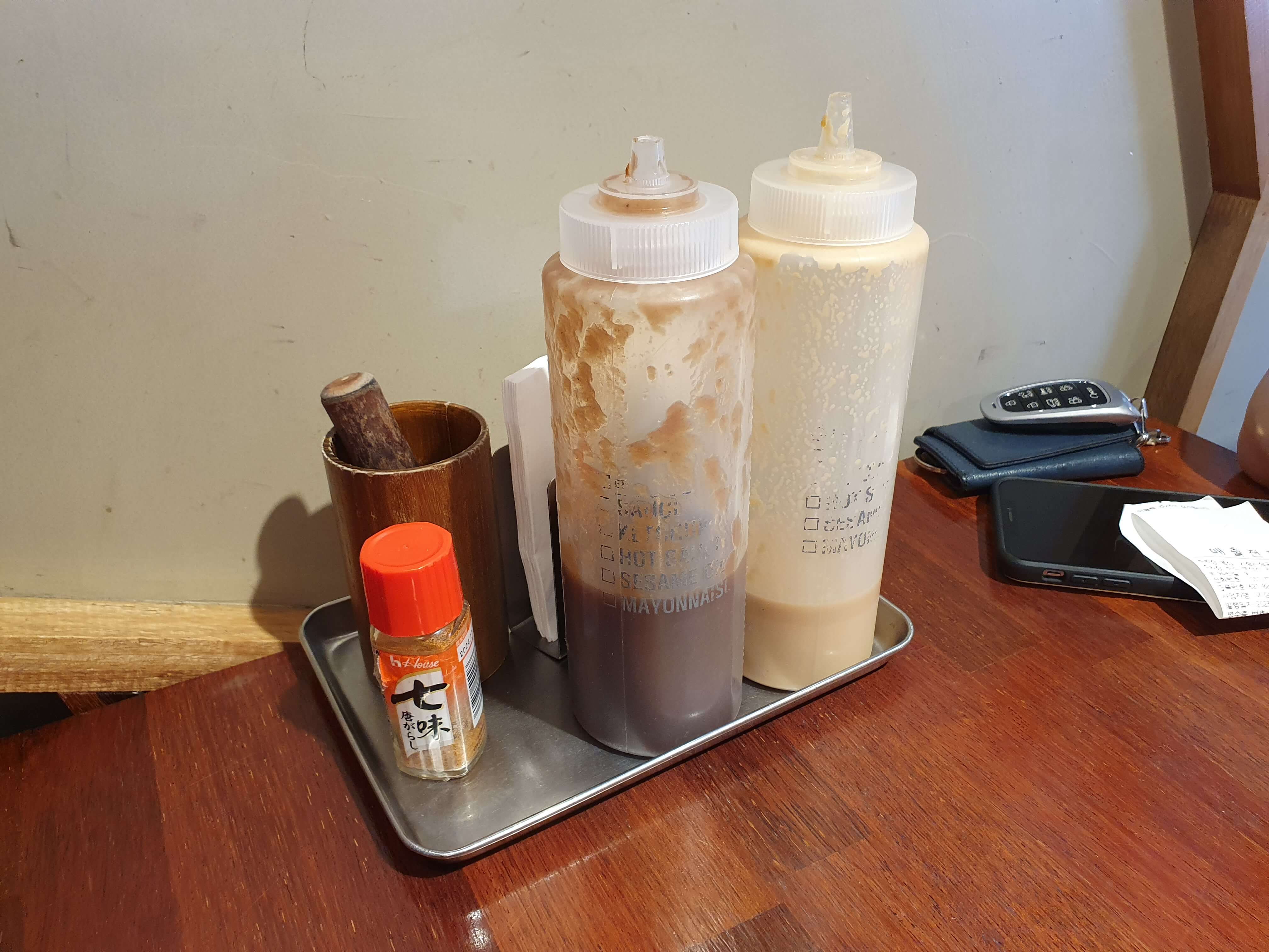 테이블에는 시치미, 참깨용 미니 절구, 돈까스소스, 샐러드소스가 준비되어 있습니다.