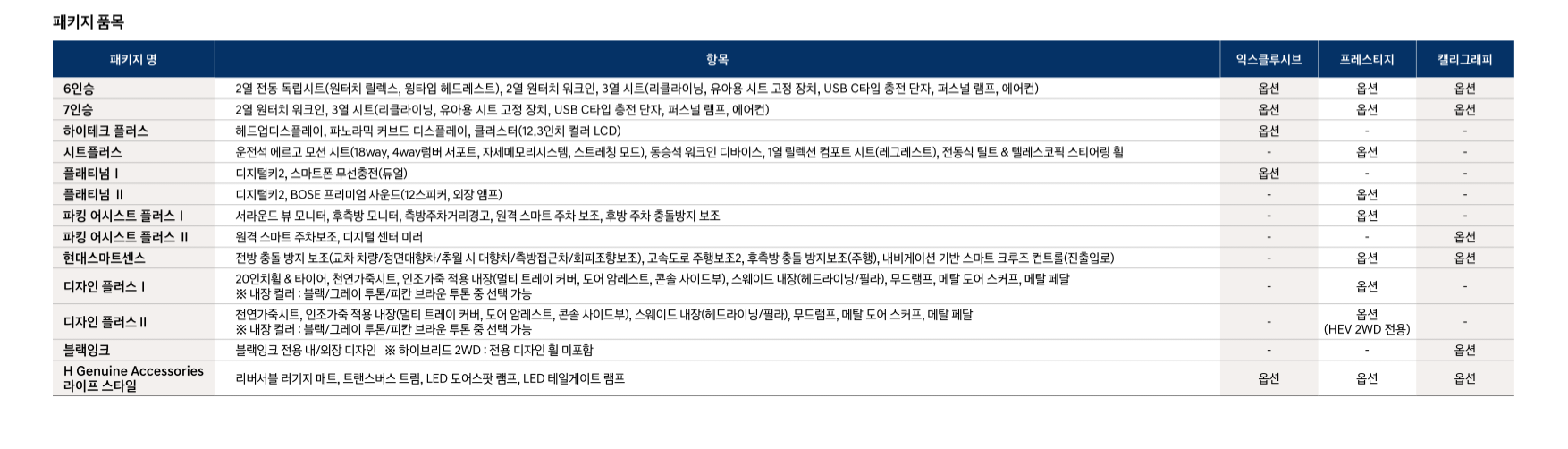 ▶ 공통 선택 품목 빌트인 캠 2 [450,000] HTRAC, 험로주행모드 [2,230,000] 6인승 [1,040,000] 7인승 [690,000] H Genuine Accessories 라이프 스타일 [490,000] 듀얼와이드선루프 + 루프랙 [990,000] 동승석 8way 전동시트 [200,000] 하이테크 플러스 [1,240,000] 플래티넘Ⅰ [450,000] |