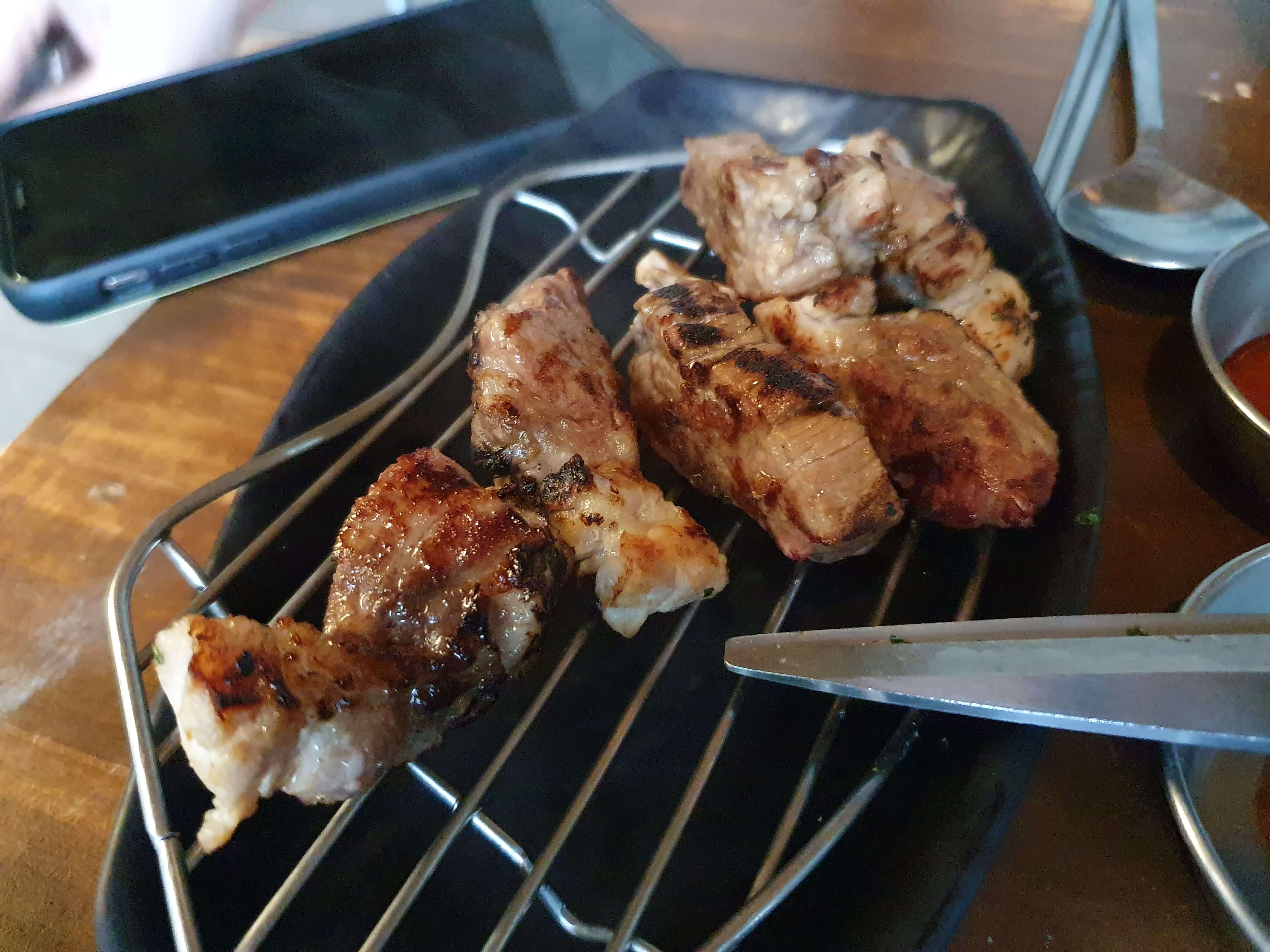 아직 친구의 고기 굽기 실력이 최고 레벨이 아니어서 탄 부분이 있습니다.