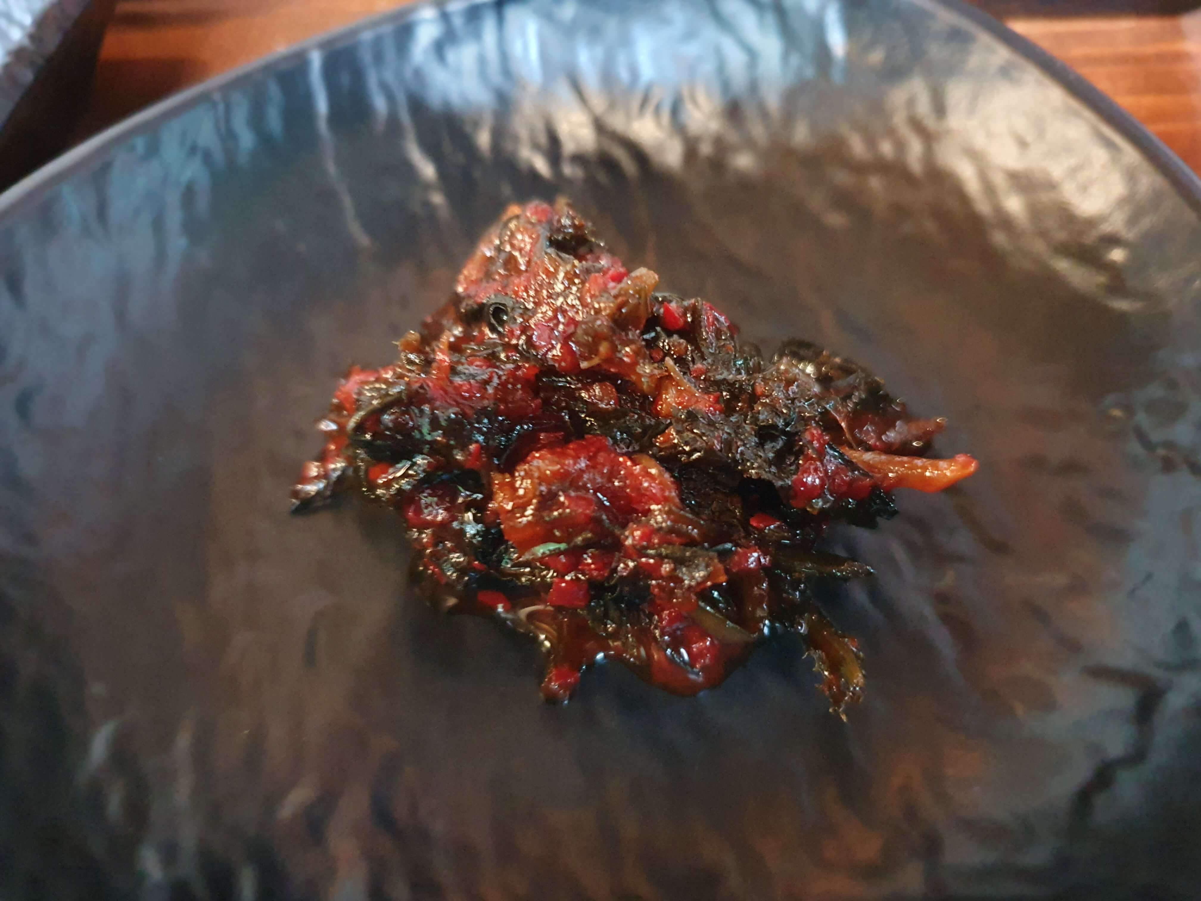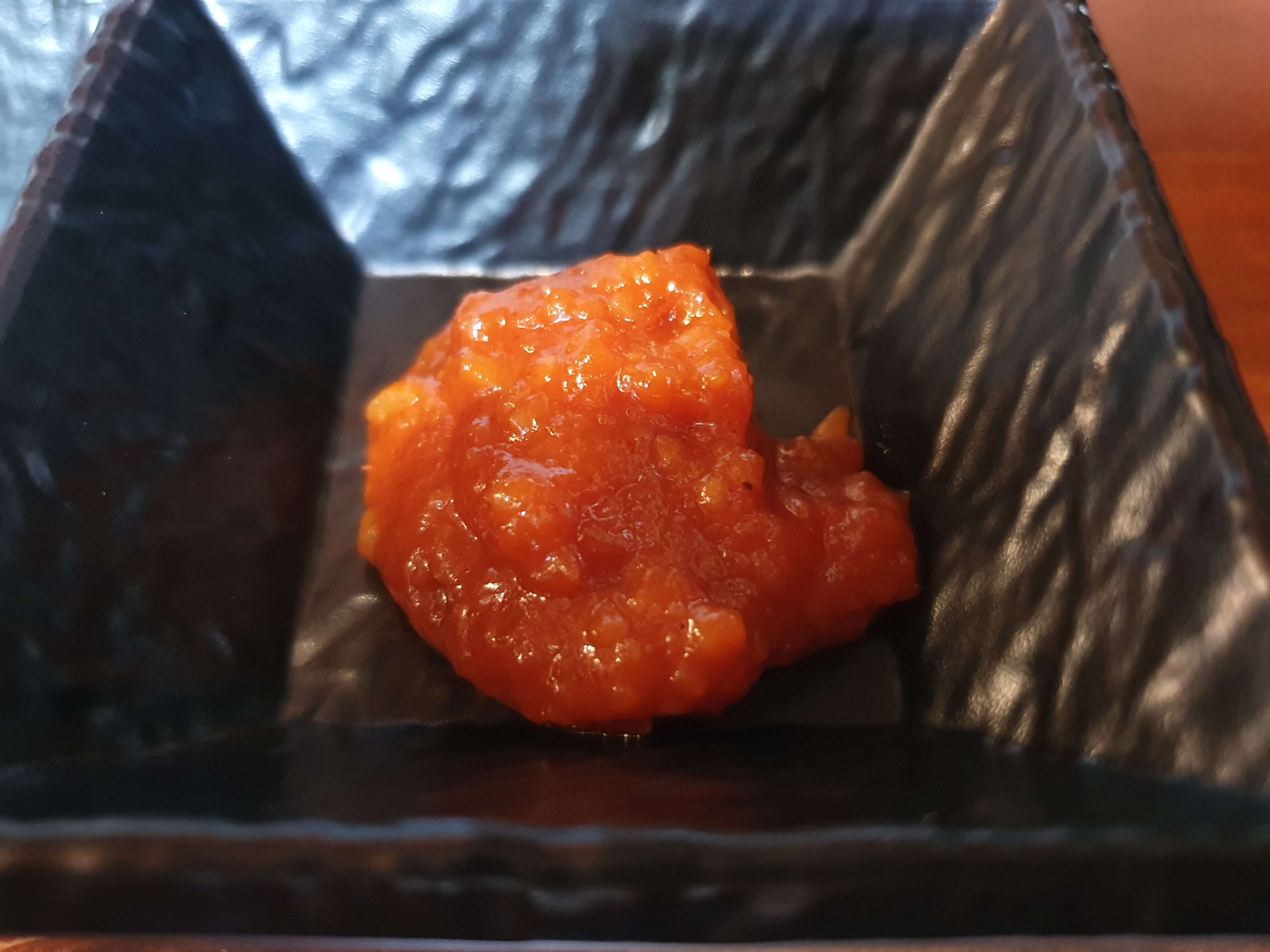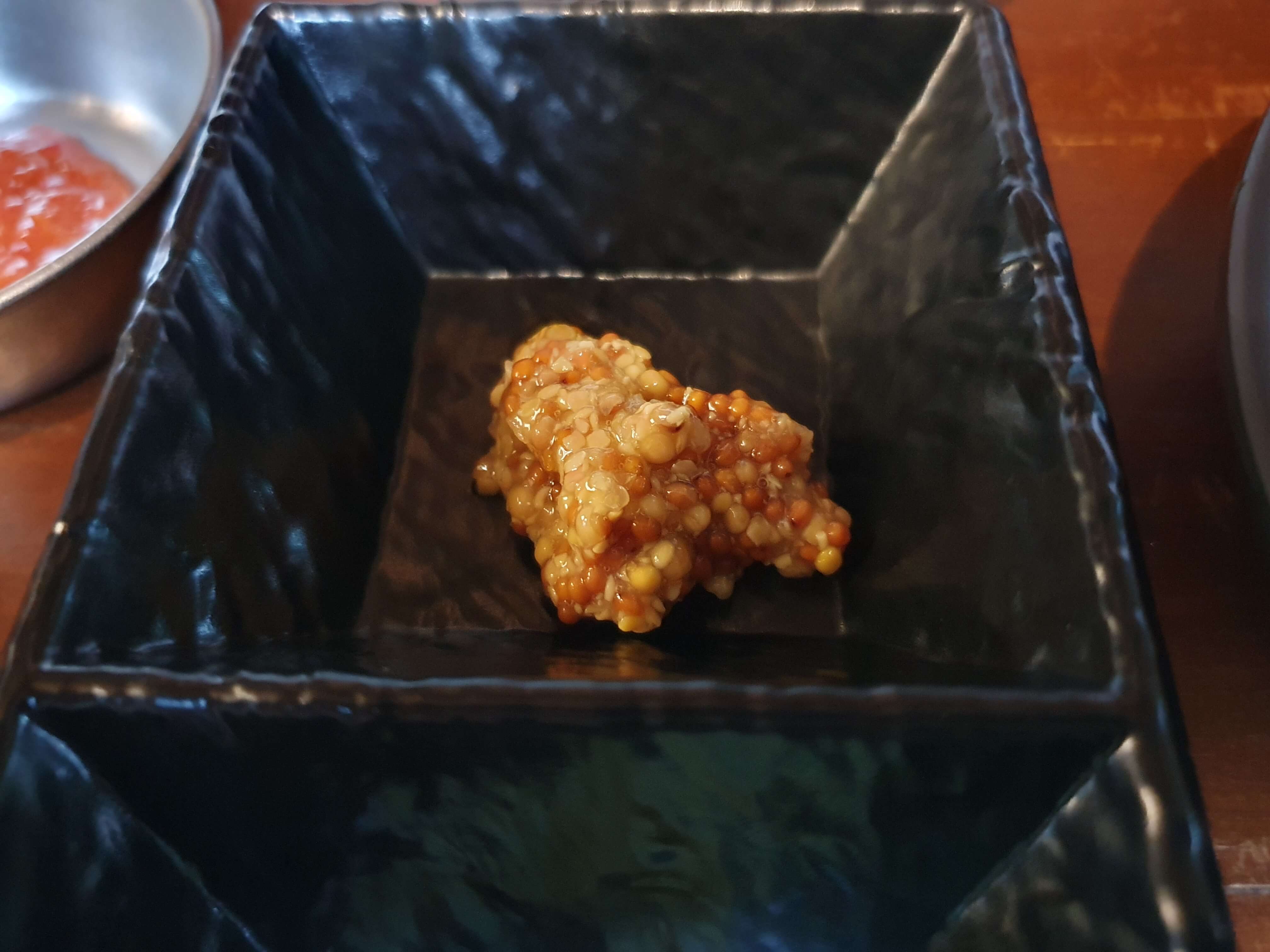 고기를 찍어먹을 수 있게 칠리소스, 젓갈, 소금, 홀그레인 머스타드, 와사비가 제공됩니다.
