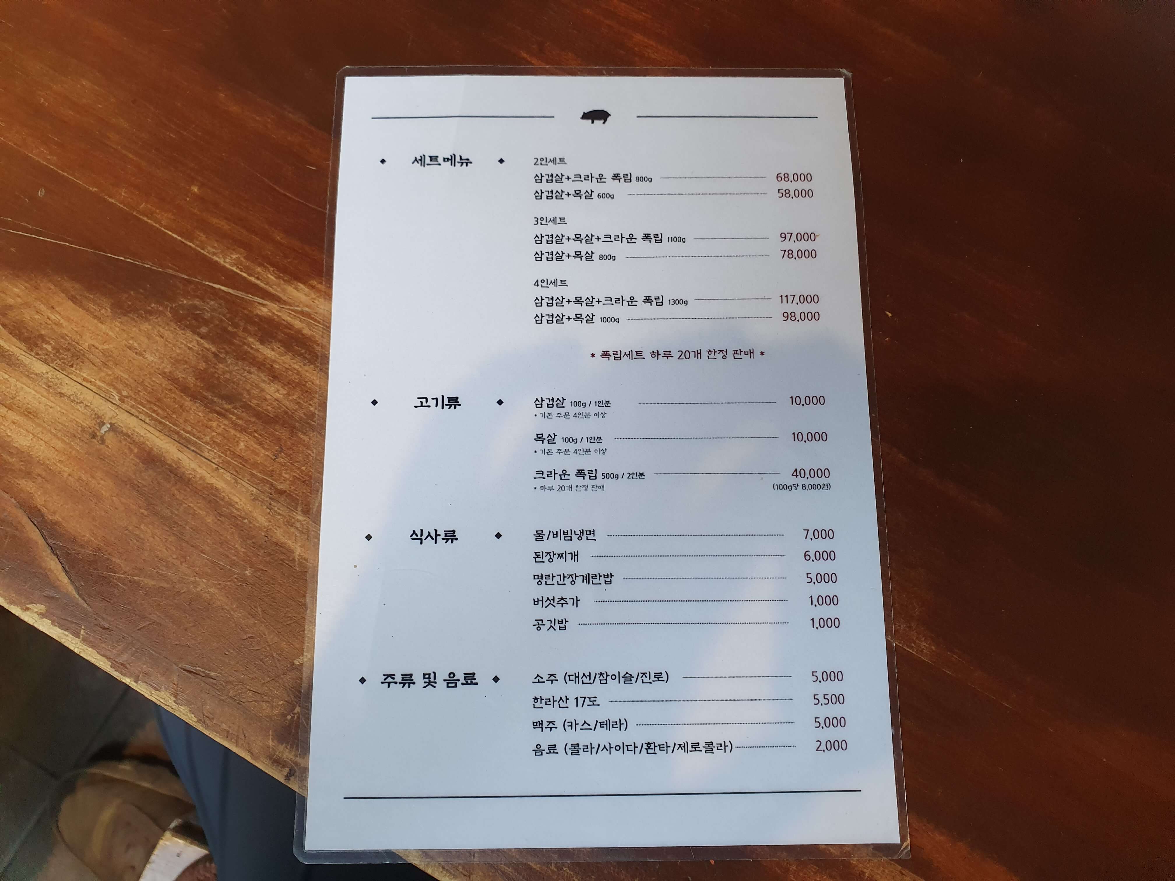 - 주메뉴 : 삼겹살, 목살, 크라운 폭립, 물냉면, 비빔냉면, 된장찌개, 명란간장계란밥