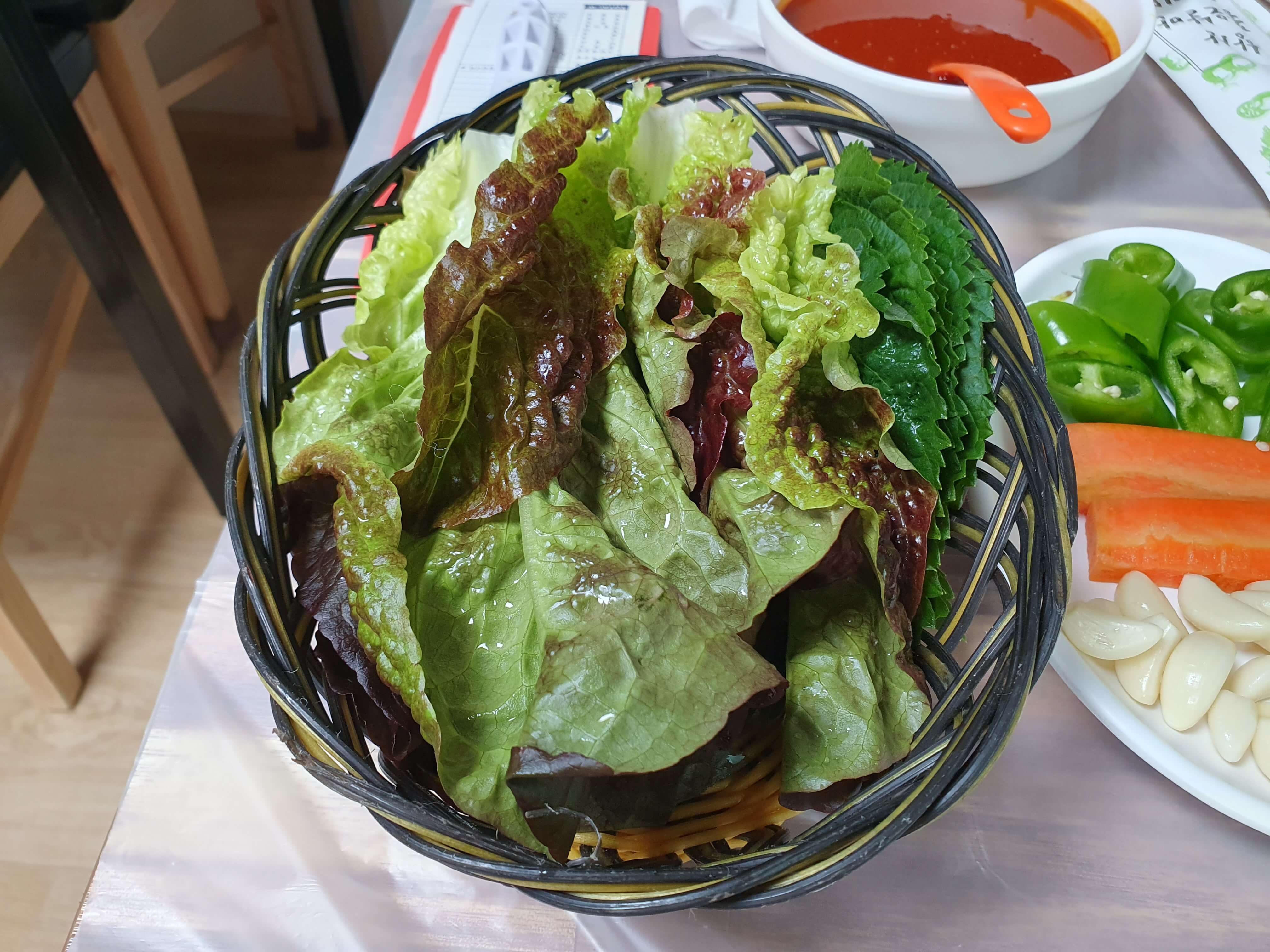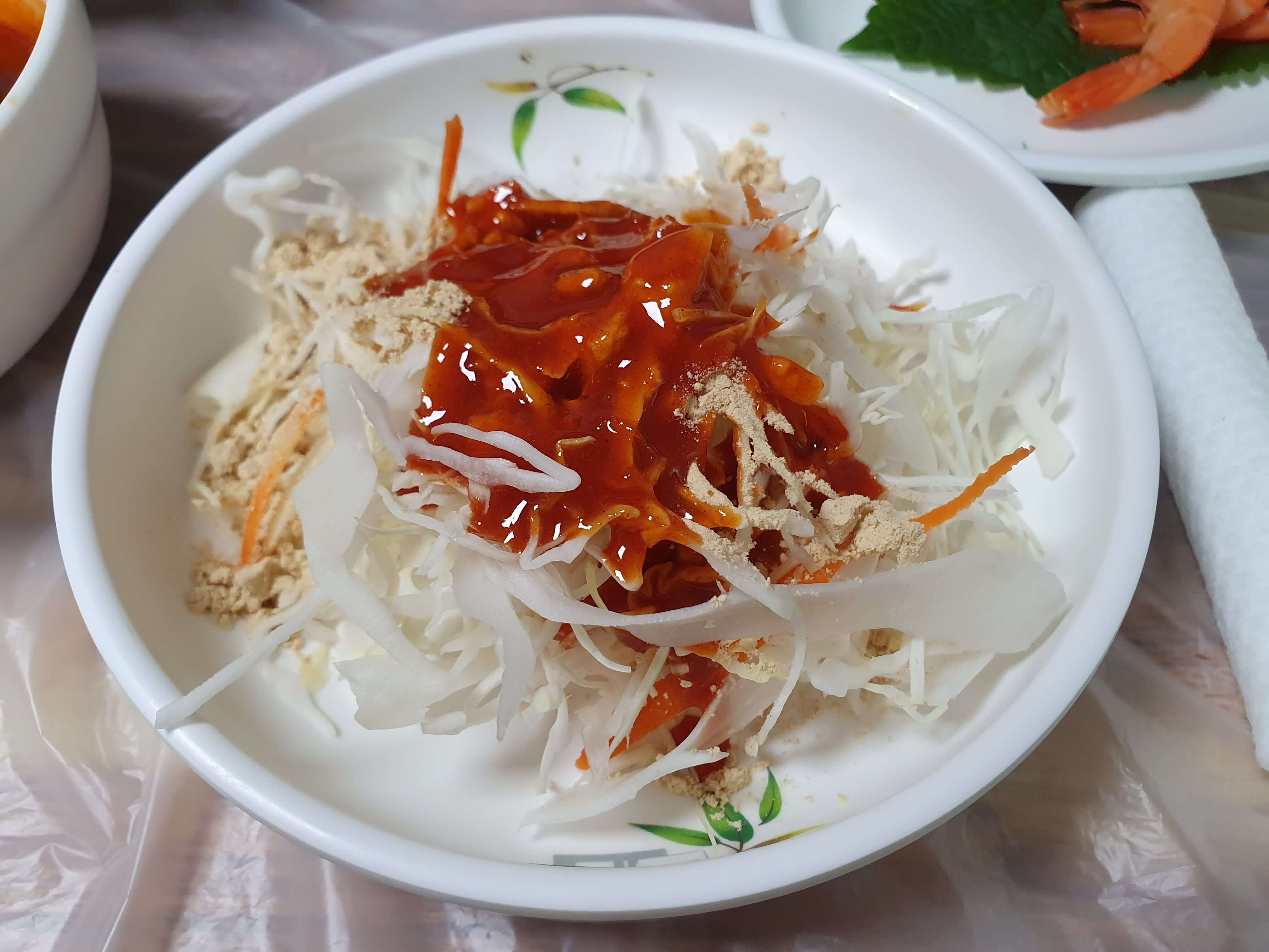 붕장어 회는 그냥 먹어도 되지만, 채썬 양배추를 콩고물과 초장에 버무린 후 초생강, 마늘, 고추를 상추에 쌈을 싸먹으면 정말 맛있습니다.