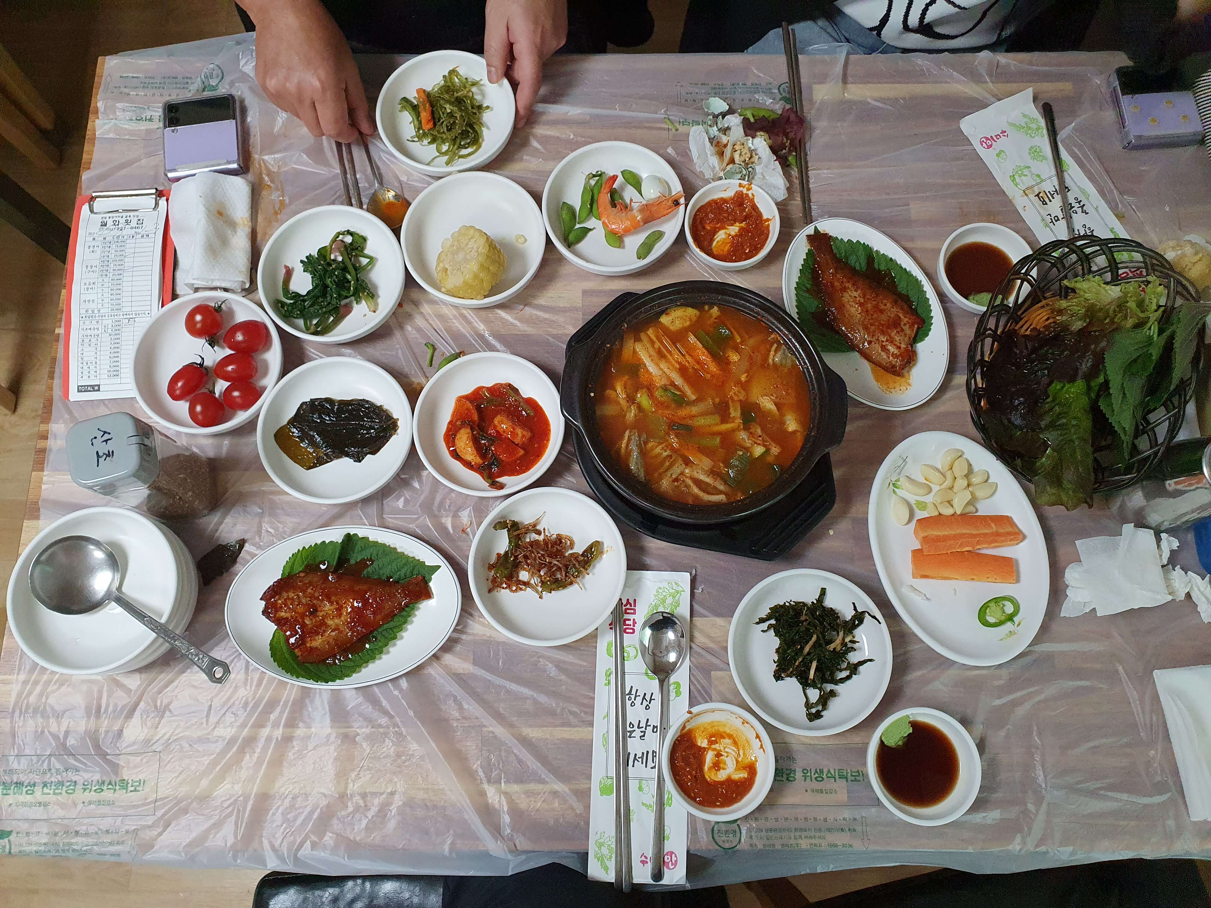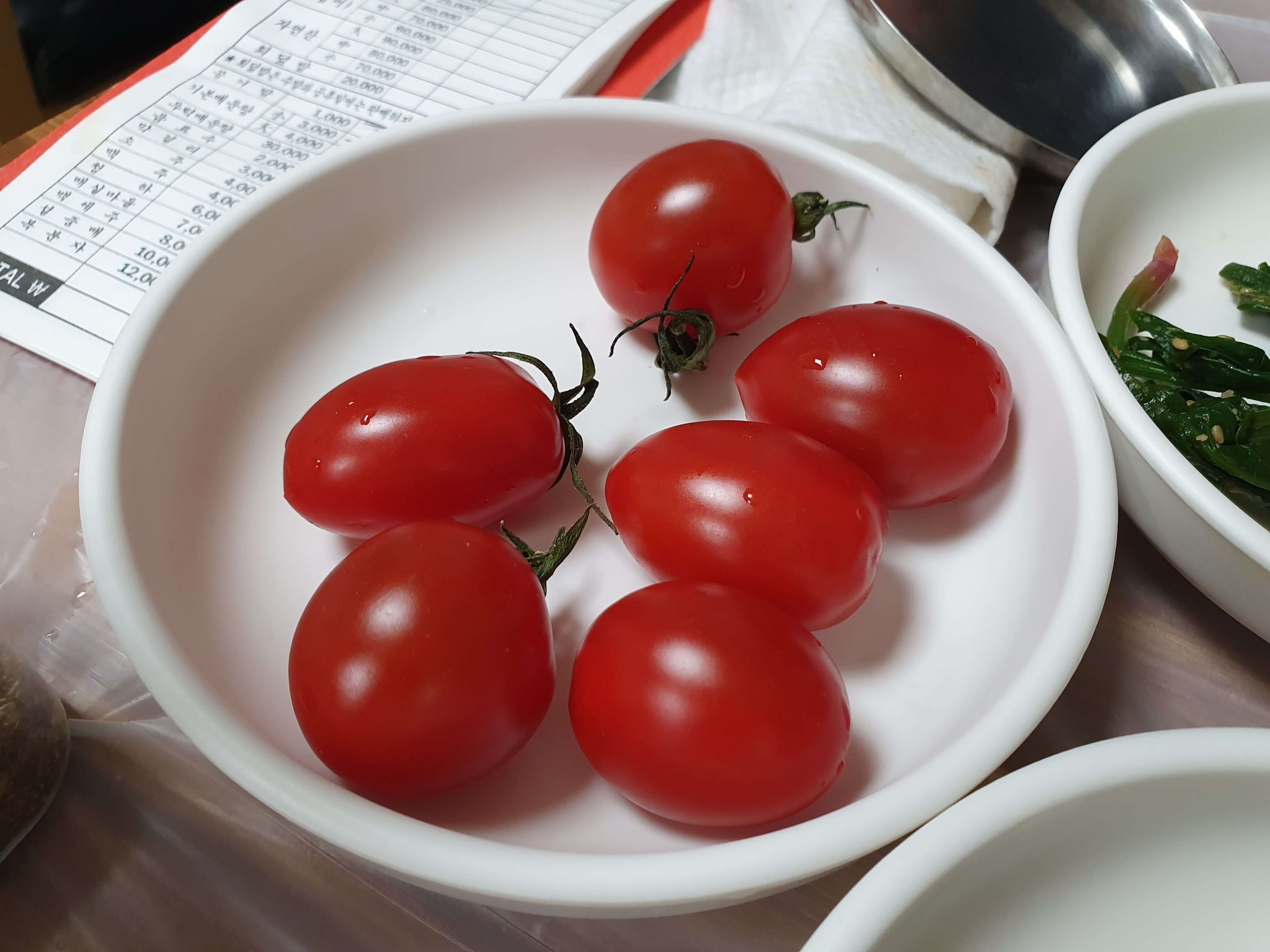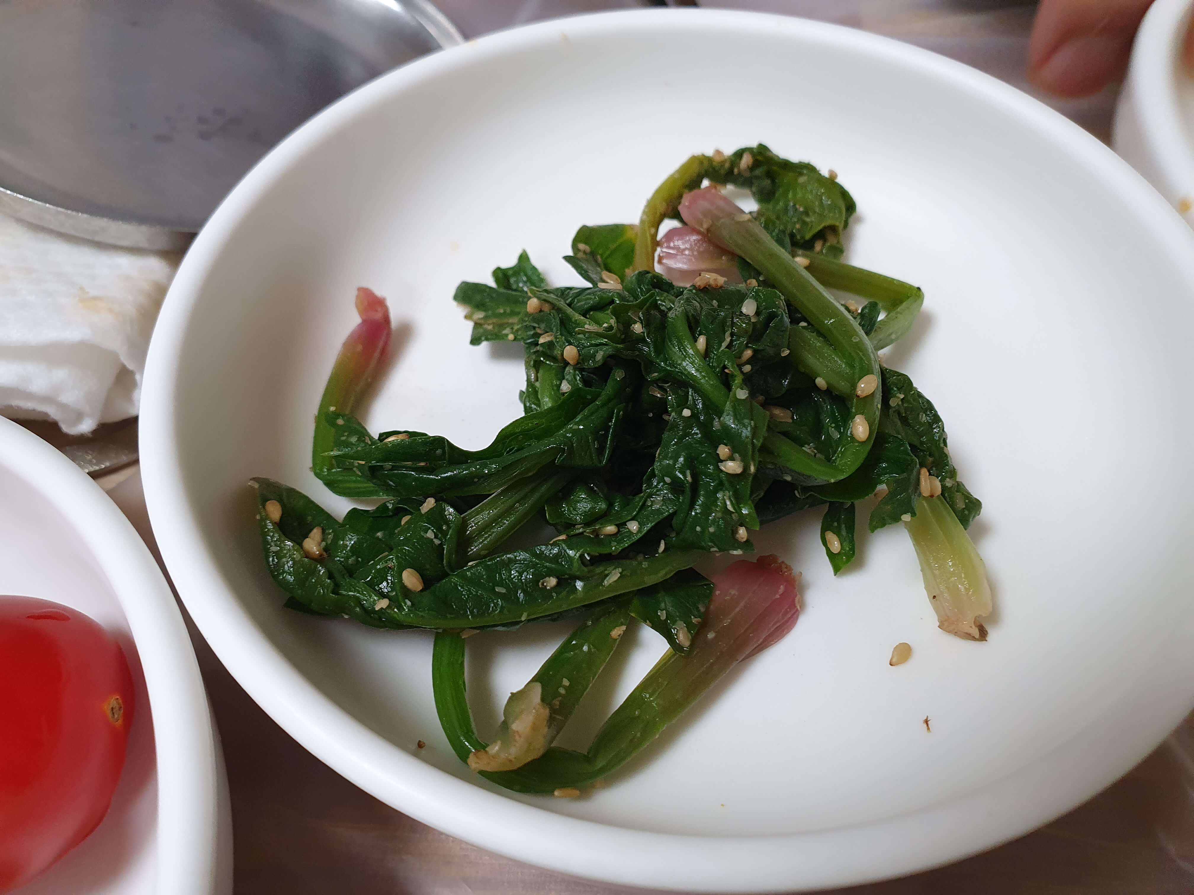 매운탕을 주문하면 깍두기, 톳나물 무침, 멸치볶음, 가자미조림, 깻잎, 시금치무침, 미역줄기볶음, 방울토마토가 반찬으로 나옵니다.