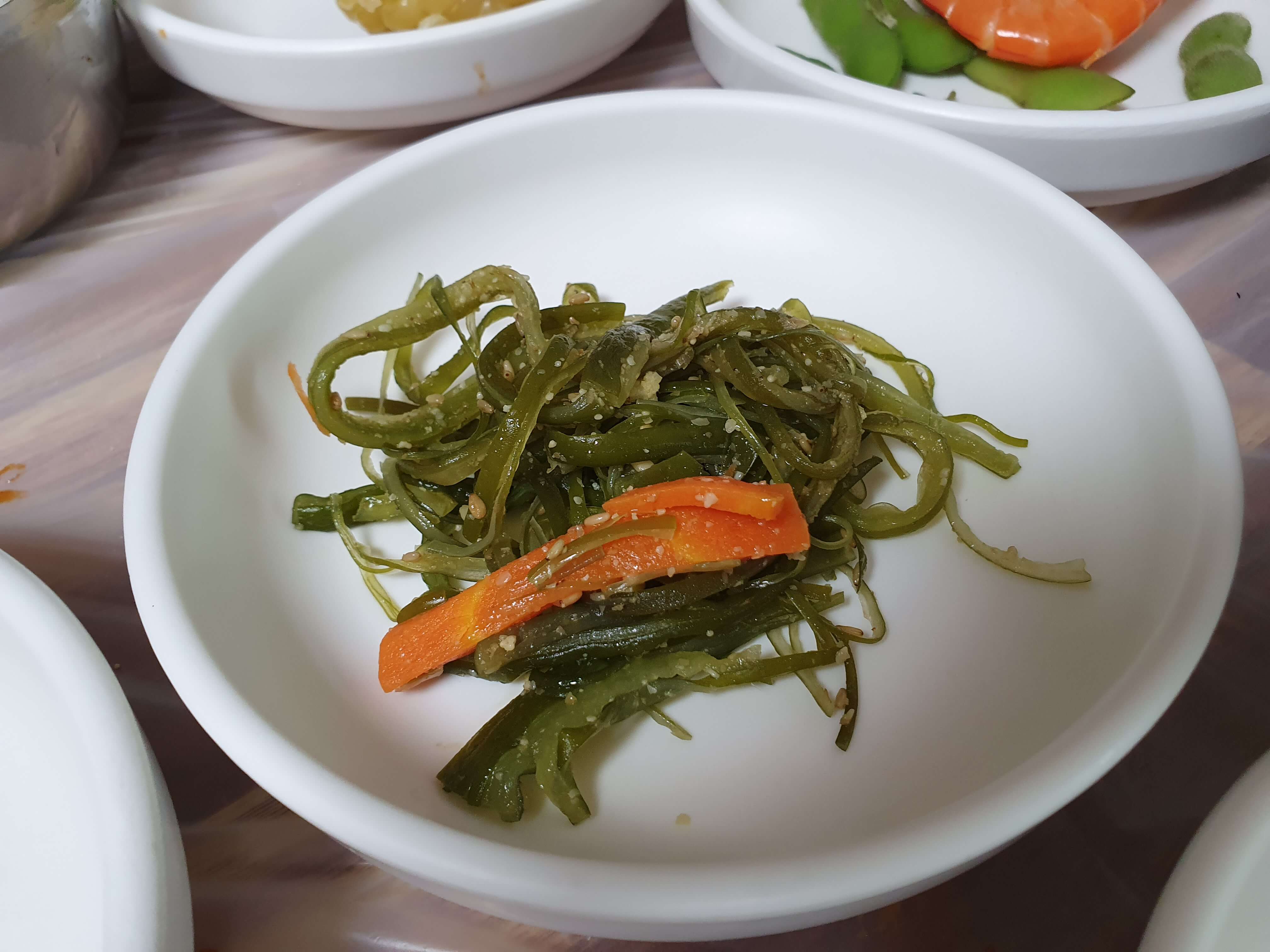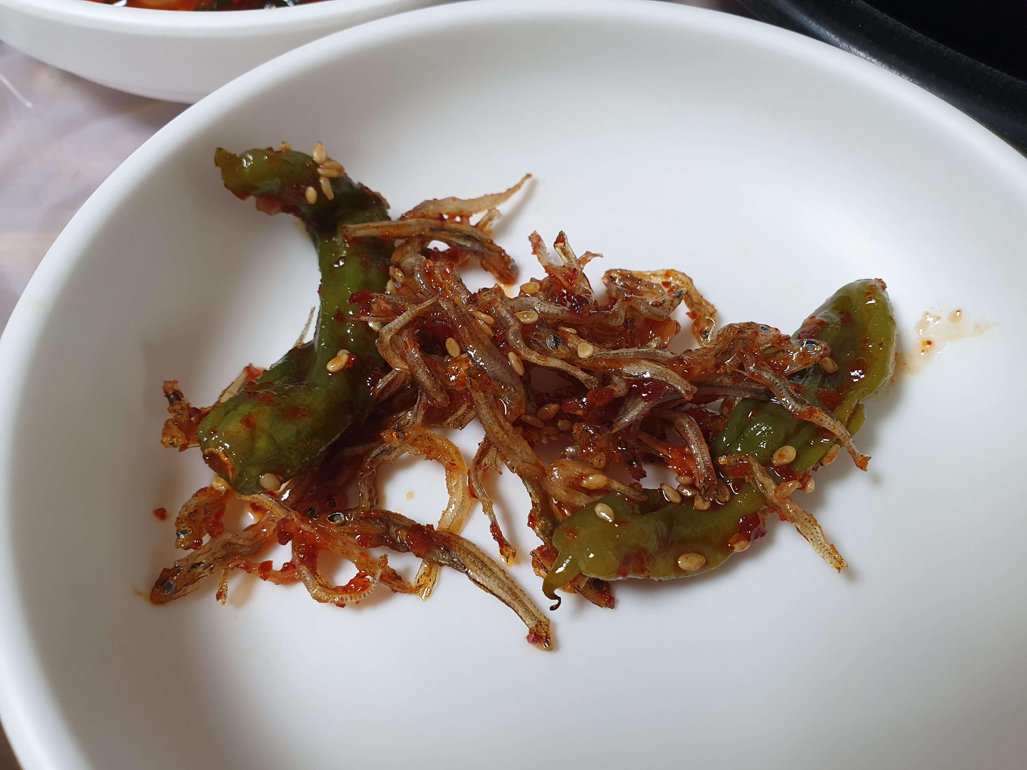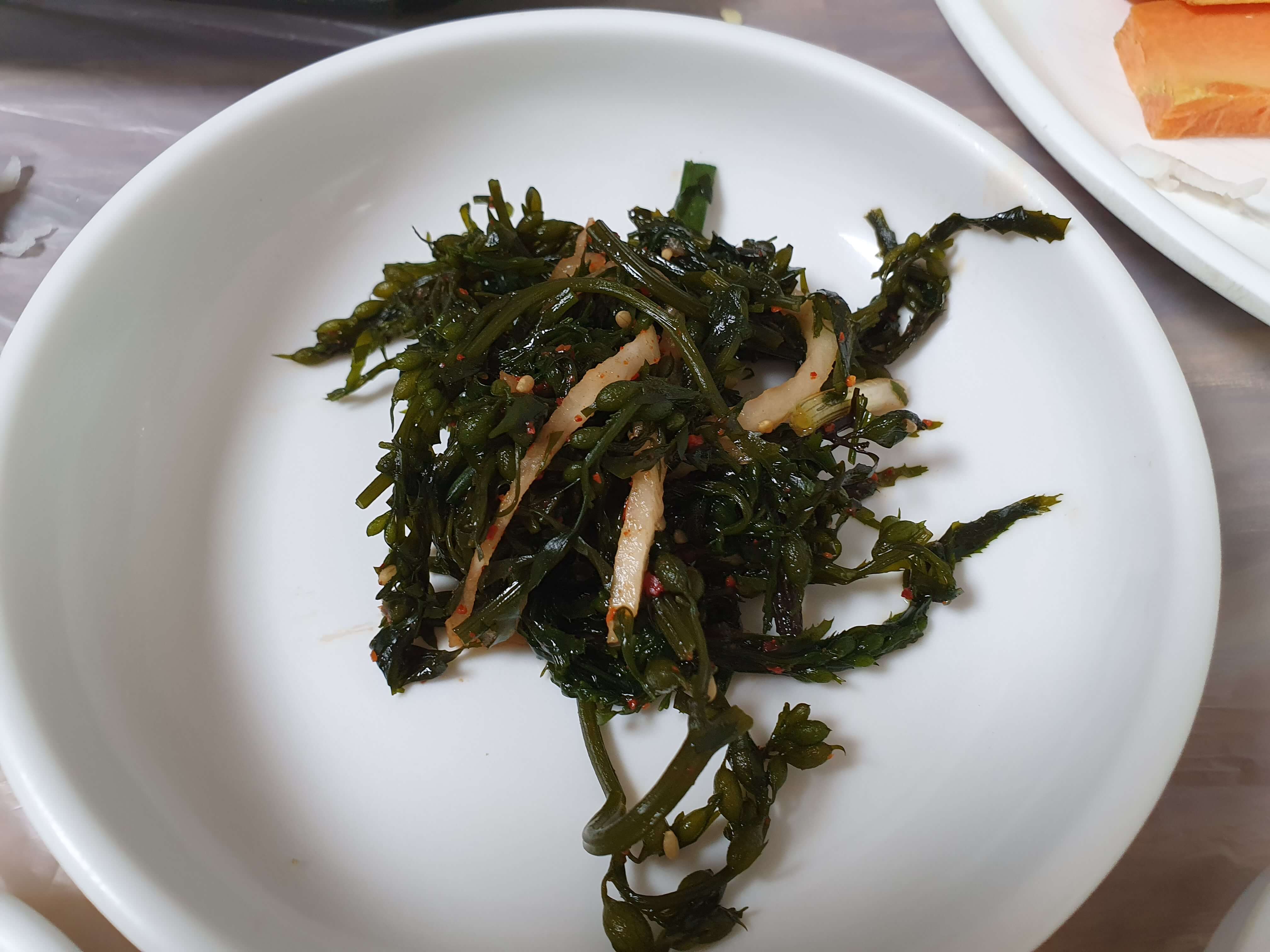 매운탕을 주문하면 깍두기, 톳나물 무침, 멸치볶음, 가자미조림, 깻잎, 시금치무침, 미역줄기볶음, 방울토마토가 반찬으로 나옵니다.