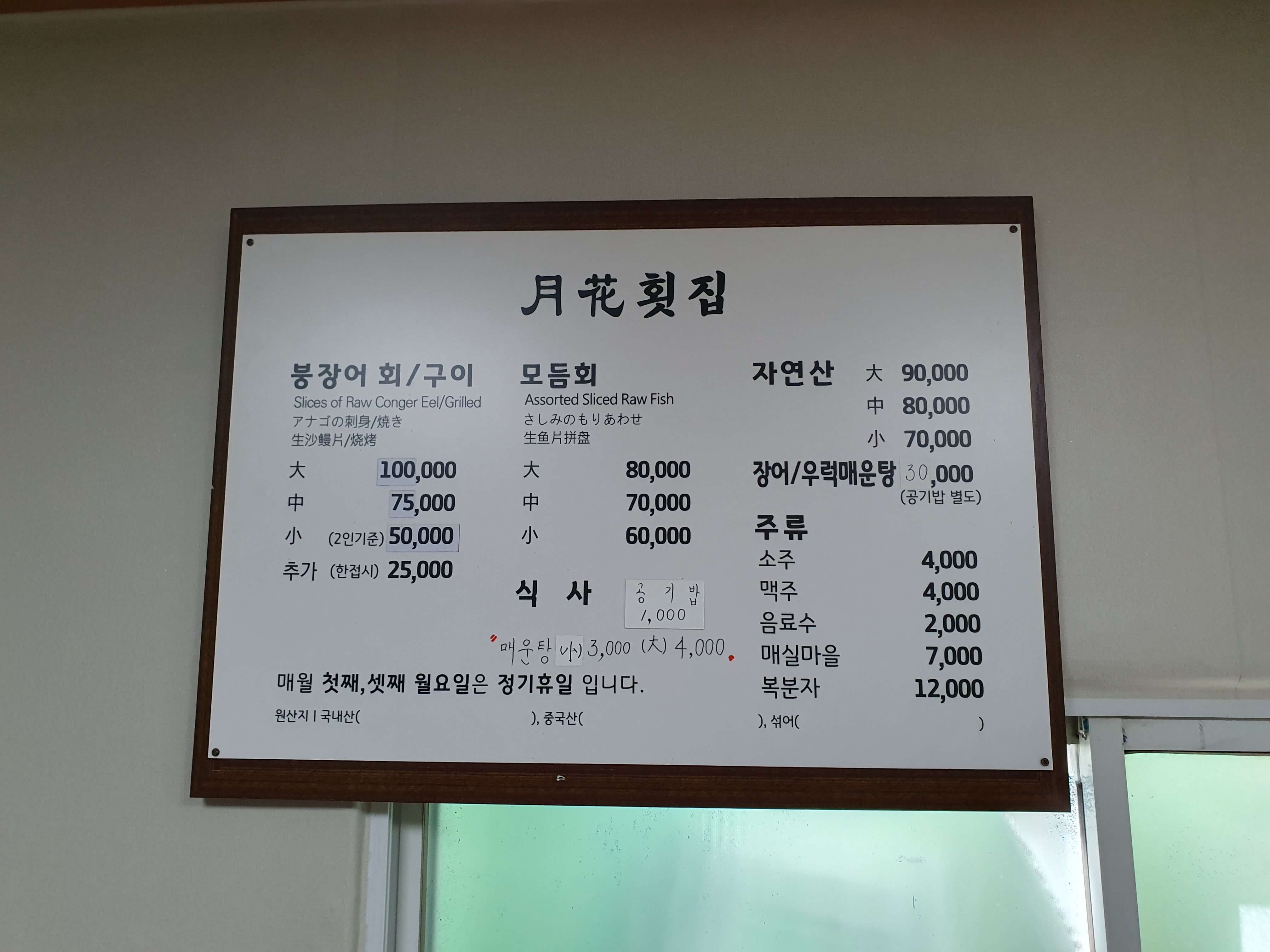 월화횟집 메뉴입니다.