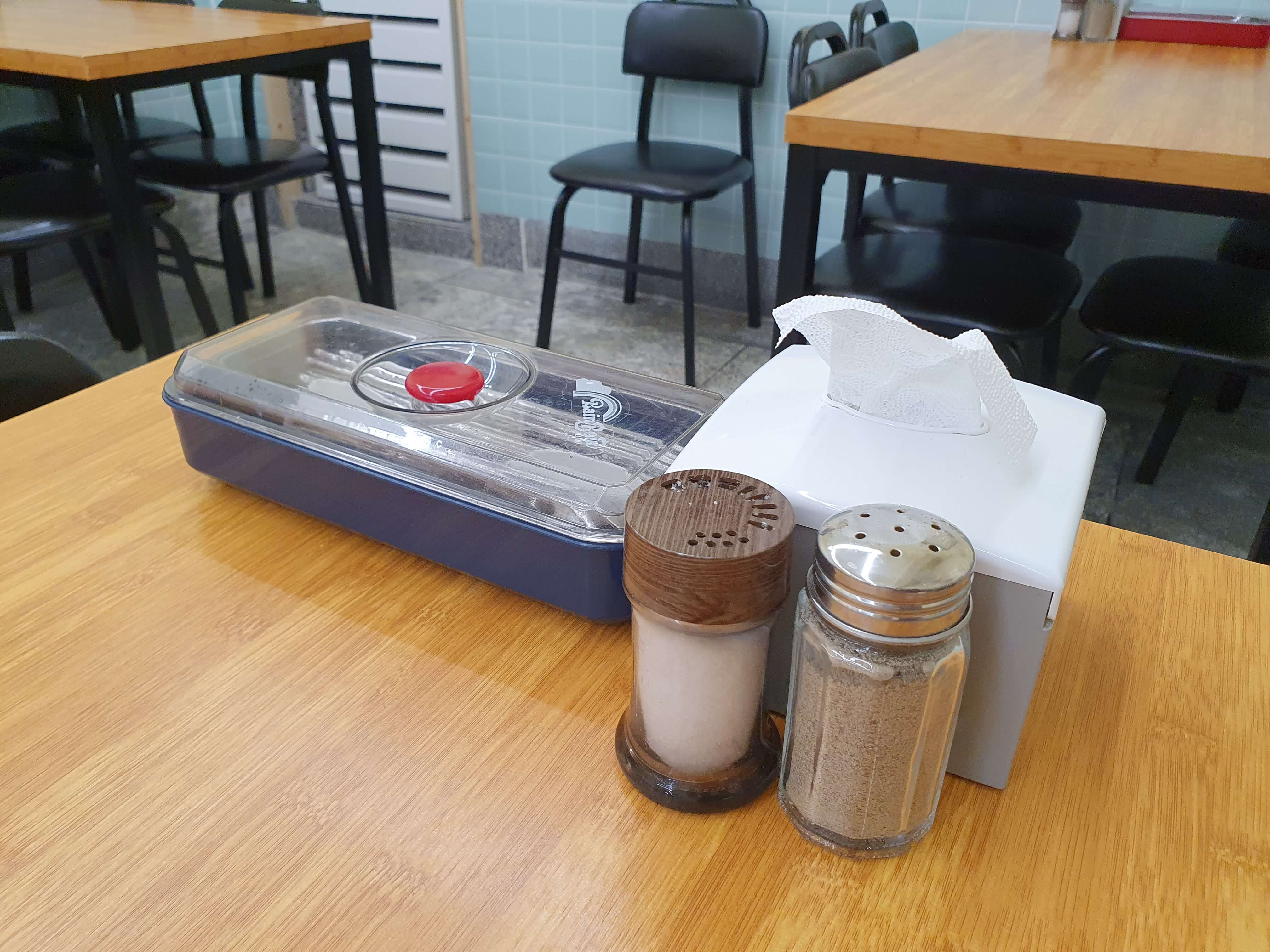 테이블에는 소금, 후추, 수저통, 휴지가 준비되어 있습니다.