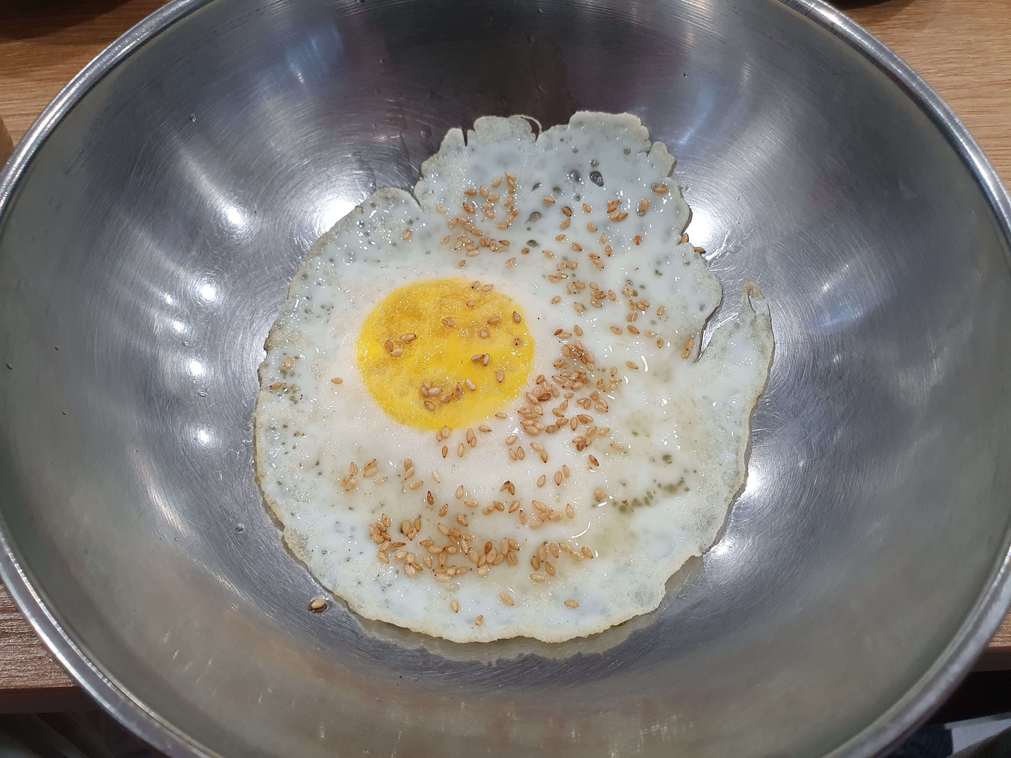 비빔밥을 해먹을 수 있게 넓은 그릇에 계란후라이를 제공합니다.